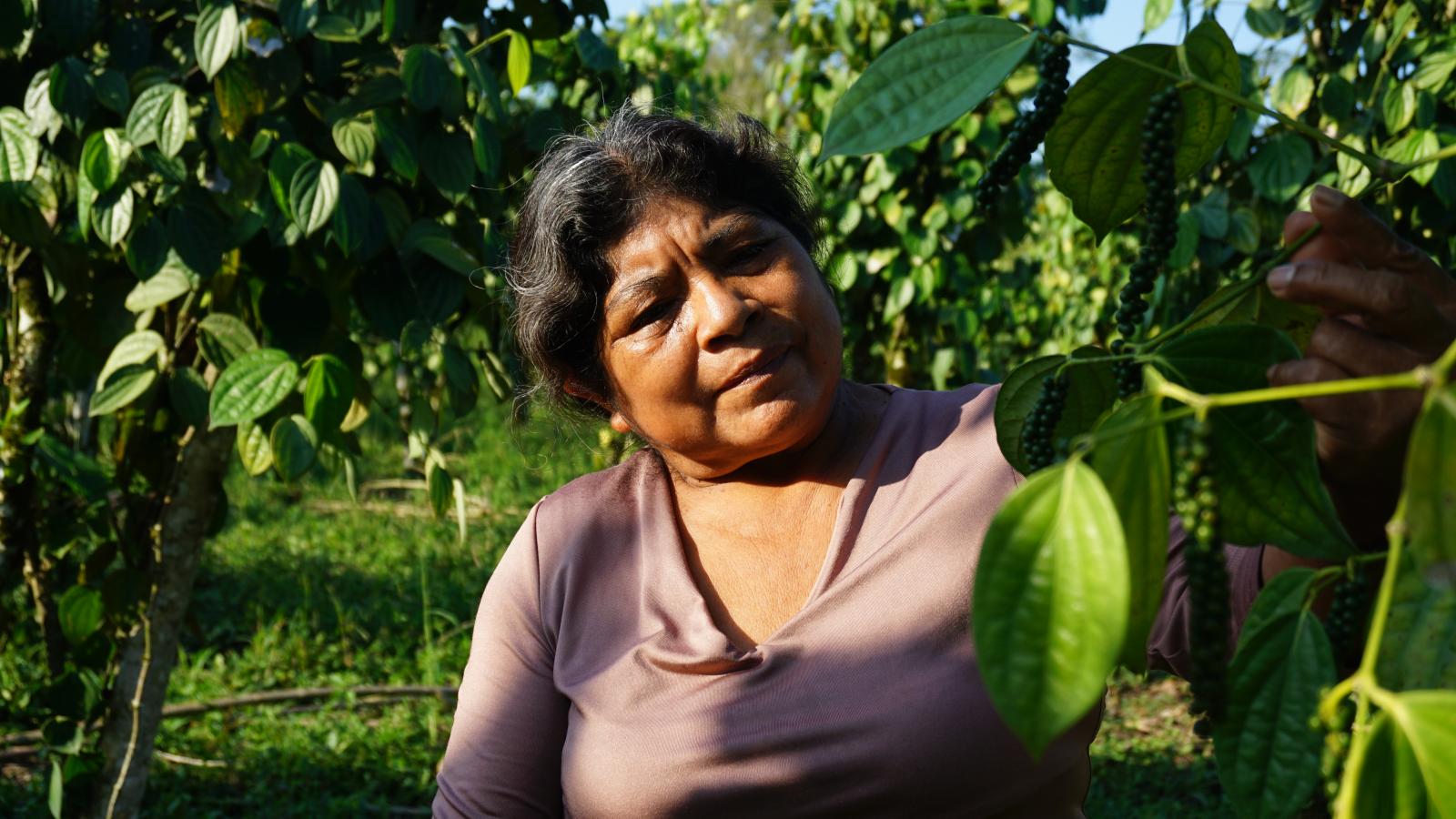 Las más jóvenes en el campo de Flor Alicia se encuentra tras la puerta trasera de su casa. Allí tiene sus cerca de mil plantas de pimienta que se elevan abrazadas a los delgados troncos, a los que se llama tutores. Hace cinco años, decidió sembrar esta especia, de la que no sabía nada. “Yo ni siquiera la había probado —confiesa sonriendo—. Ahora me la como así no más, en pepa: con huevos, con papa, en las salsas”.