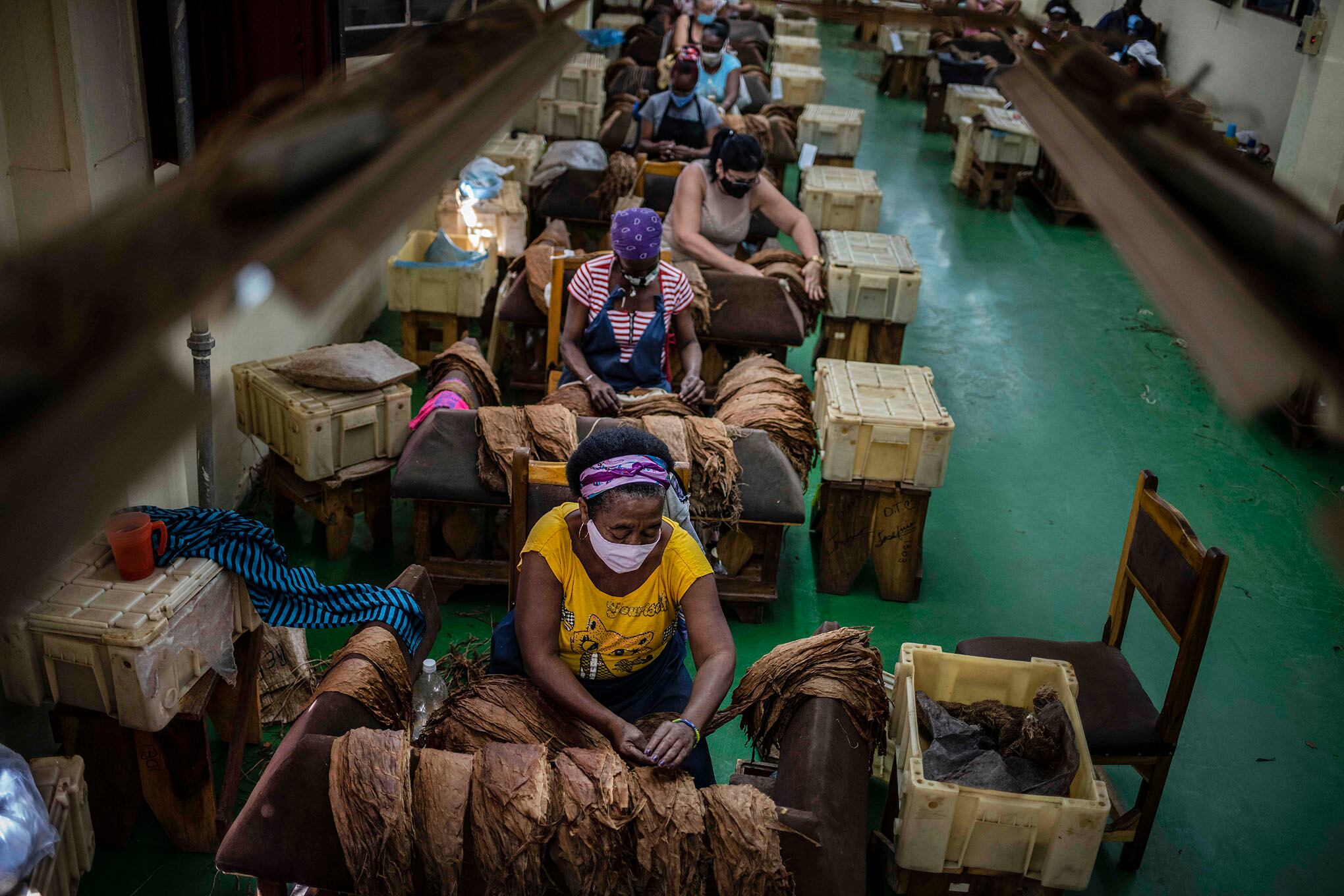 Foto: APTrabajadores con mascarillas protectoras seleccionan las mejores hojas para liar puros en la fábrica Partagás en La Habana, Cuba, el jueves 11 de marzo de 2021, en medio de la nueva pandemia de coronavirus. A pesar del impacto de la covid-19 en la economía cubana, los famosos puros continúan su marcha en el mercado global. Foto: AP / Ramon Espinosa.