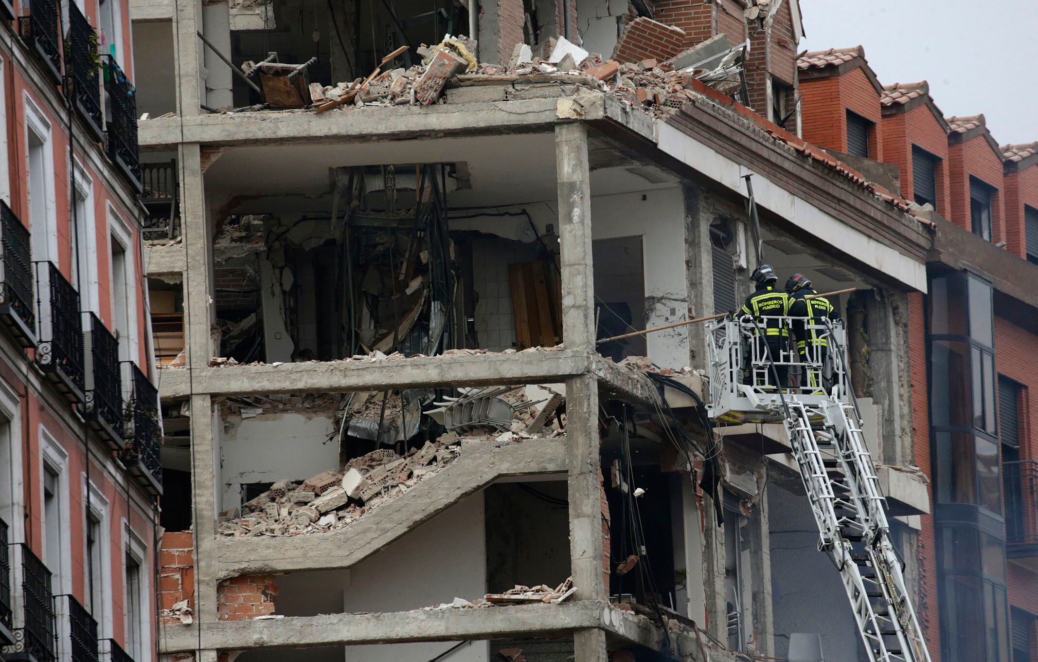 Los bomberos inspeccionan los escombros causados por una explosión en el centro de Madrid, España, el miércoles 20 de enero de 2021. Una fuerte explosión destruyó parcialmente un pequeño edificio flanqueado por una escuela y una residencia de ancianos en el centro de la capital de España. Foto: AP / Bernat Armangue.