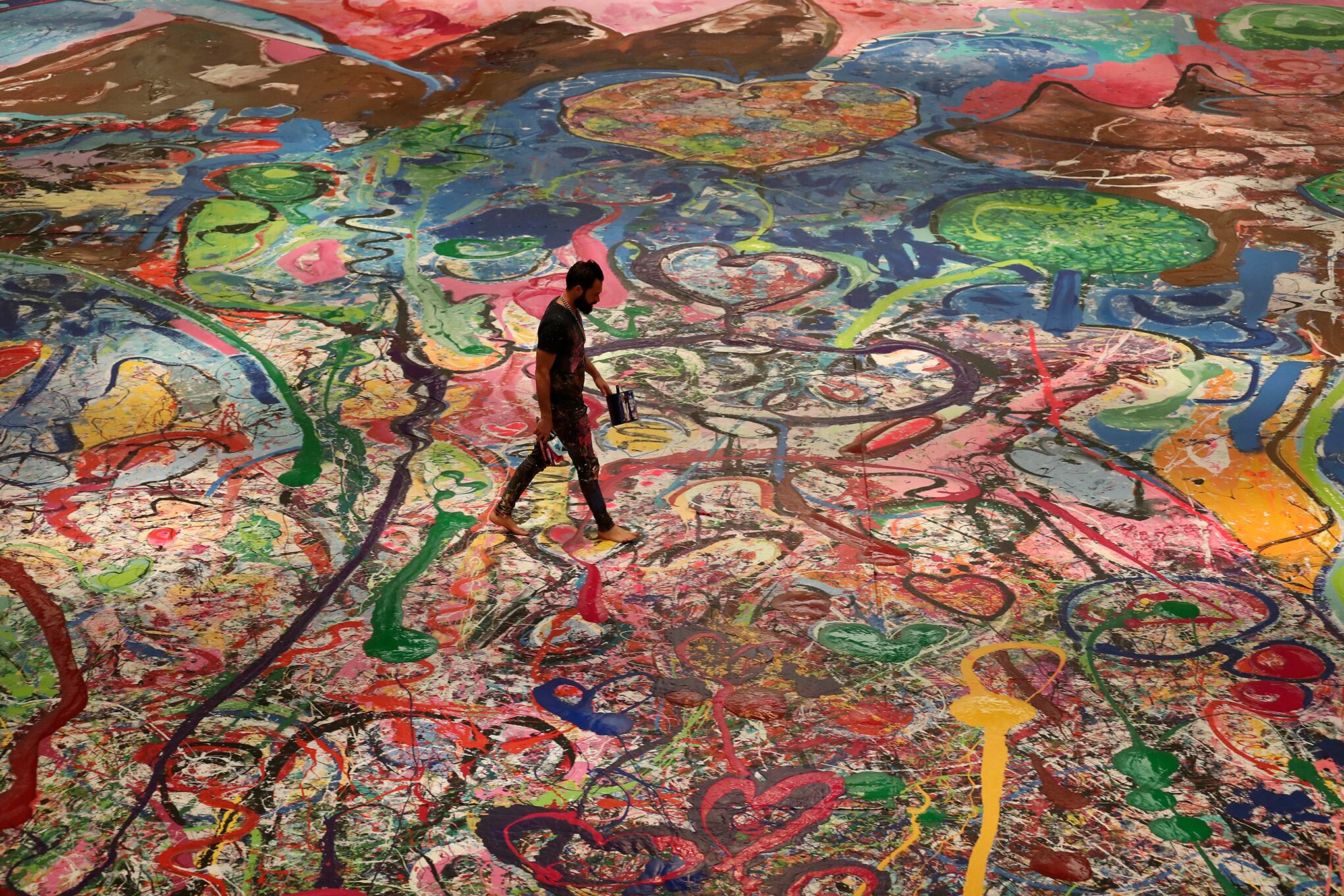 Foto: APEl artista británico Sacha Jafri trabaja en su pintura récord titulada "El viaje de la humanidad" en Dubai, Emiratos Árabes Unidos. Foto: AP / Kamran Jebreili