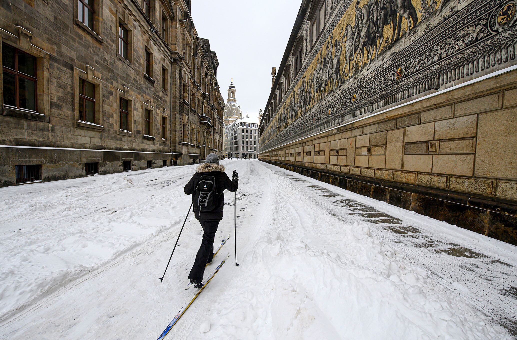 Foto: APUna mujer usa esquís de fondo mientras camina por la ciudad vieja de Dresde en Alemania. Gran parte de Alemania esta afectada por un fuerte clima invernal. Foto: Robert Michael / DPA vía AP.