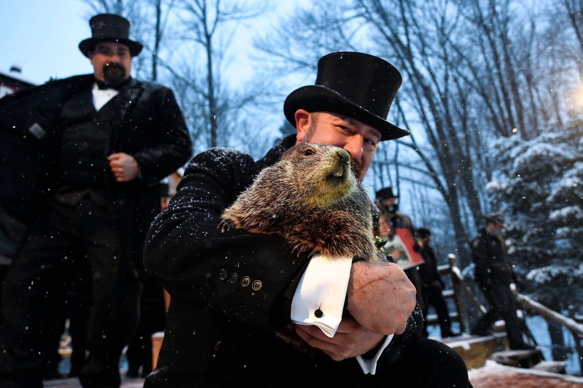 Foto: APEl entrenador del Groundhog Club, A.J. Dereume, sostiene a Punxsutawney Phil, la marmota que pronostica el clima, durante la celebración número 135 del Día de la Marmota en Gobbler's Knob, en Punxsutawney, Pensilvania, el martes 2 de febrero de 2021. Los controladores de Phil dijeron que la marmota pronosticó seis semanas más de clima invernal durante el evento del año pasado que se llevó a cabo sin la asistencia de nadie debido a los posibles riesgos por la covid-19. Foto: AP/Barry Reeger.