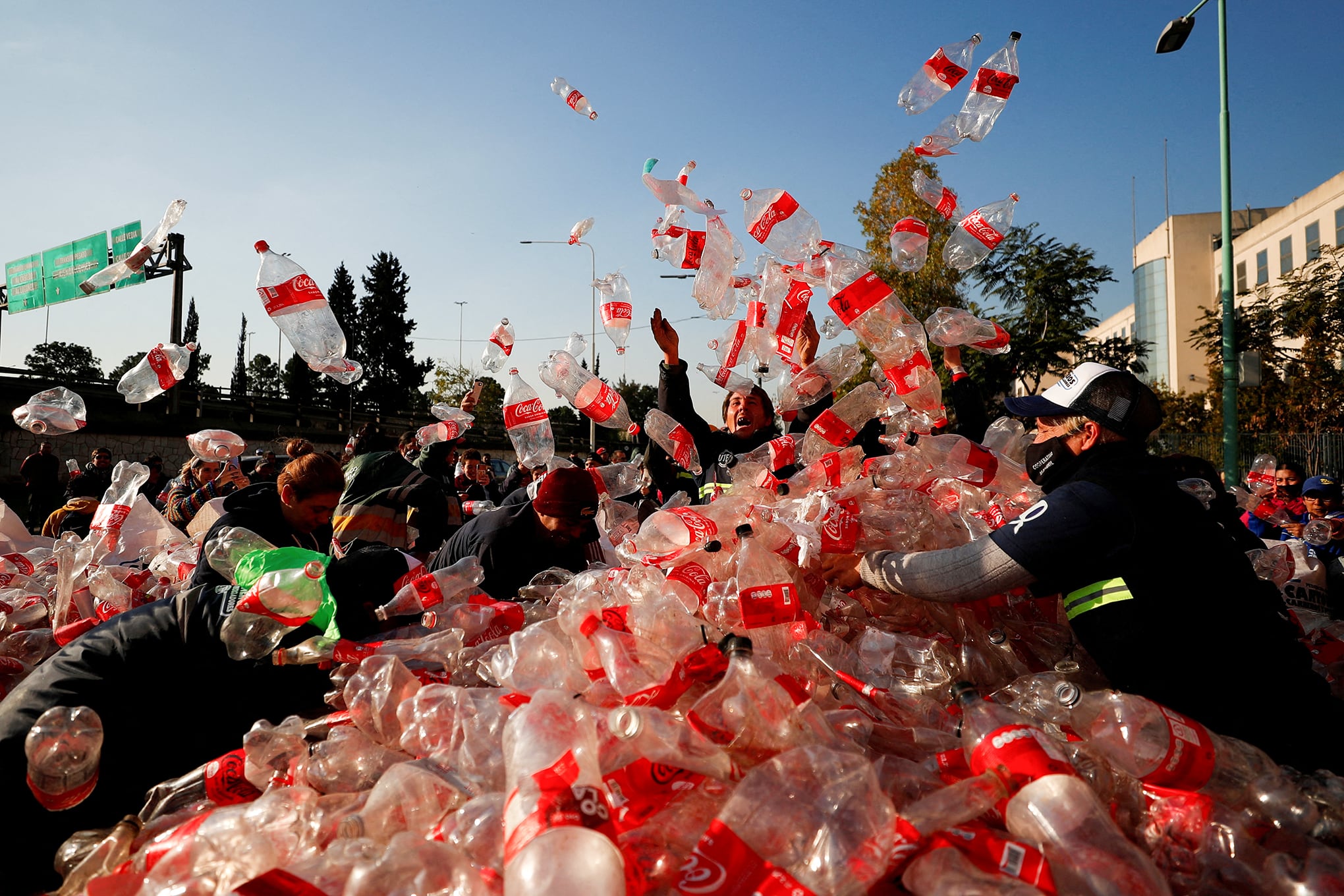Recicladores de basura protestan frente a las oficinas de Coca-Cola en demanda de una ley de reciclaje que los incluya y contra el financiamiento de sistemas privados de reciclaje, en Buenos Aires, Argentina, el 2 de junio de 2022. Foto: Reuters/Agustin Marcarian