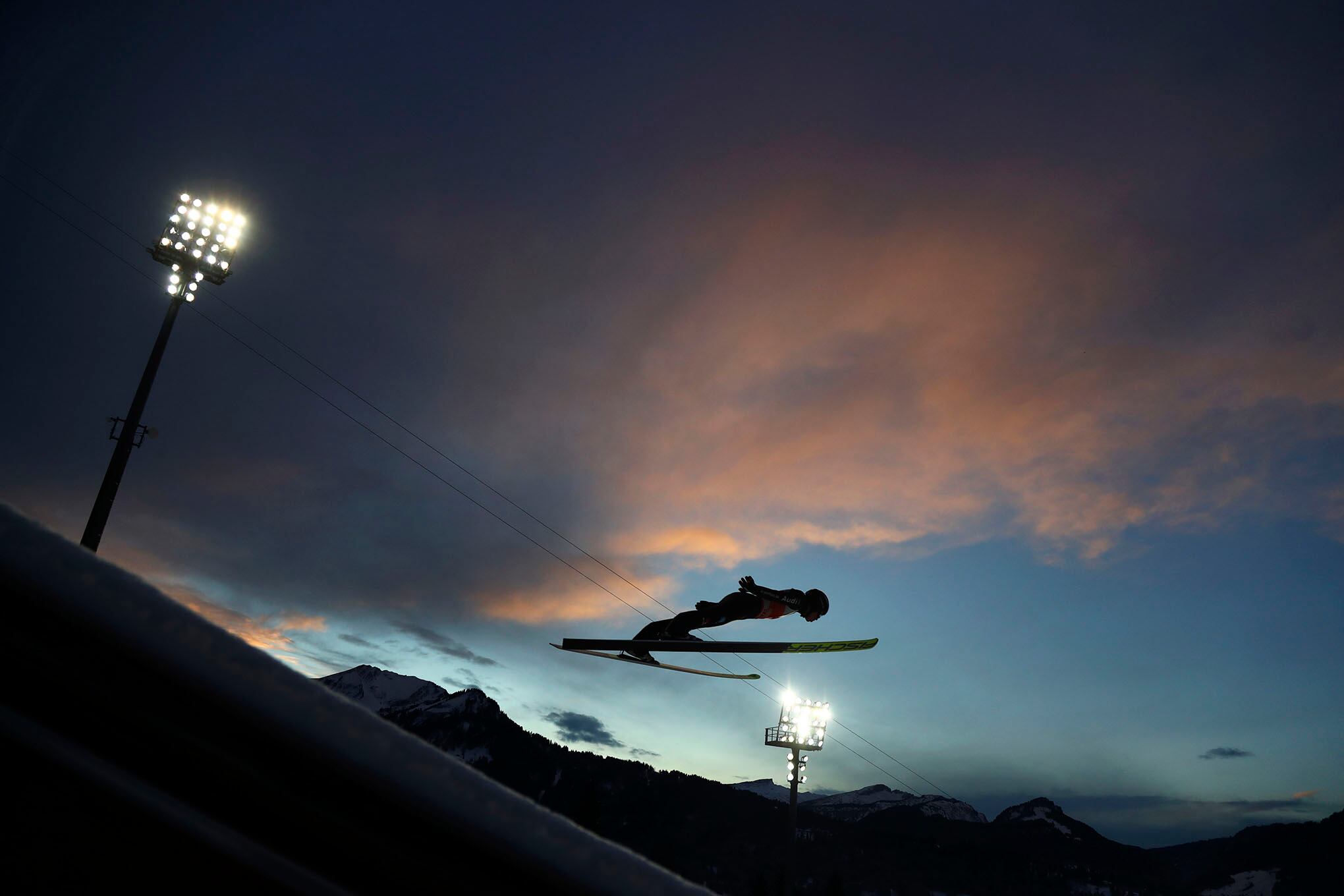 Foto: APKilian Maerkl, de Alemania, vuela por el aire durante un salto de competencia en la primera etapa de la edición 69 del torneo de saltos de esquí Four Hills en Oberstdorf, Alemania. Foto: AP / Matthias Schrader.
