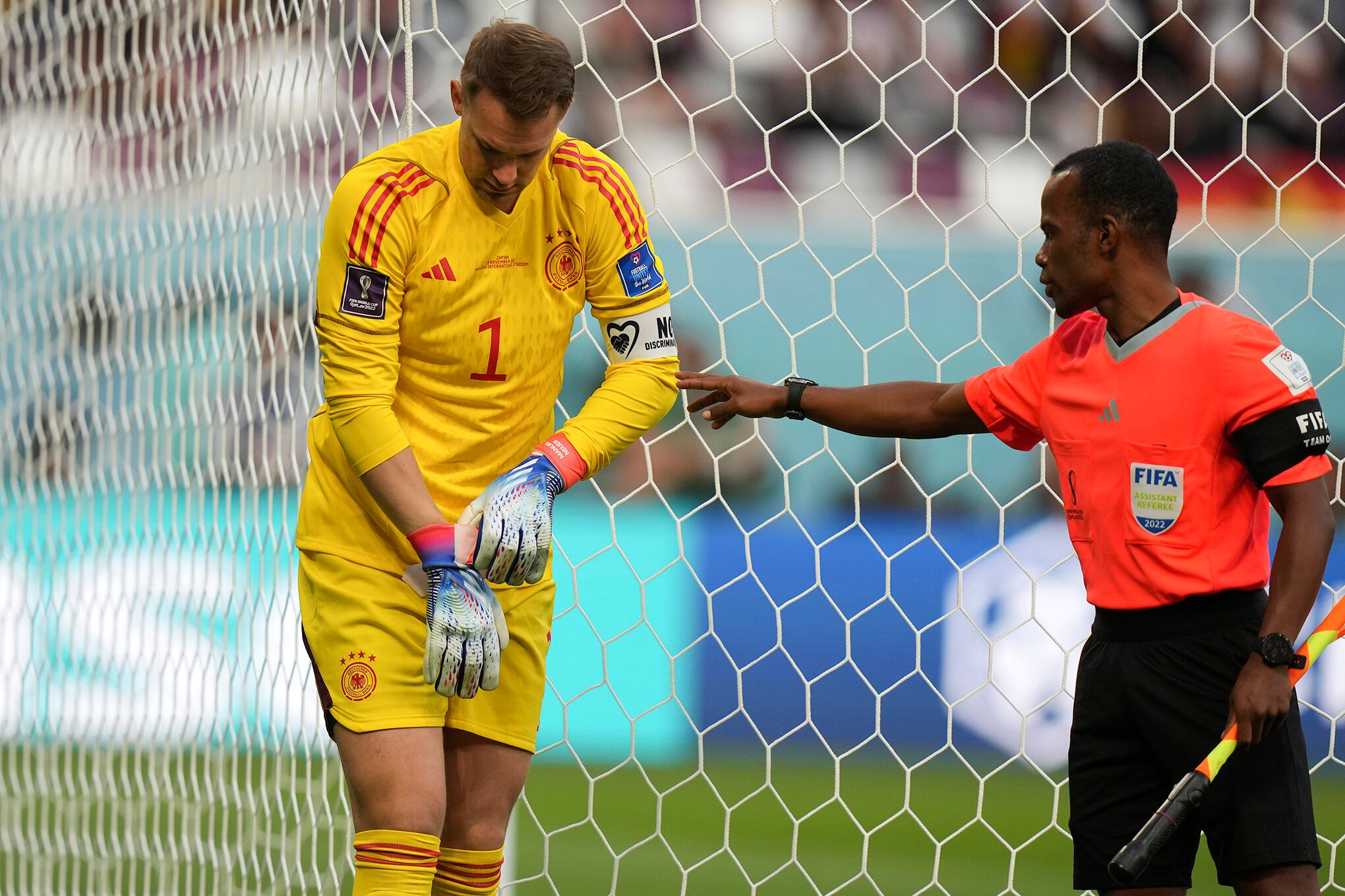 Un juez de línea revisa al portero alemán Manuel Neuer poniéndose los guantes durante el partido de fútbol del grupo E de la Copa Mundial entre Alemania y Japón, en el Estadio Internacional Khalifa en Doha, Qatar, el miércoles 23 de noviembre de 2022.