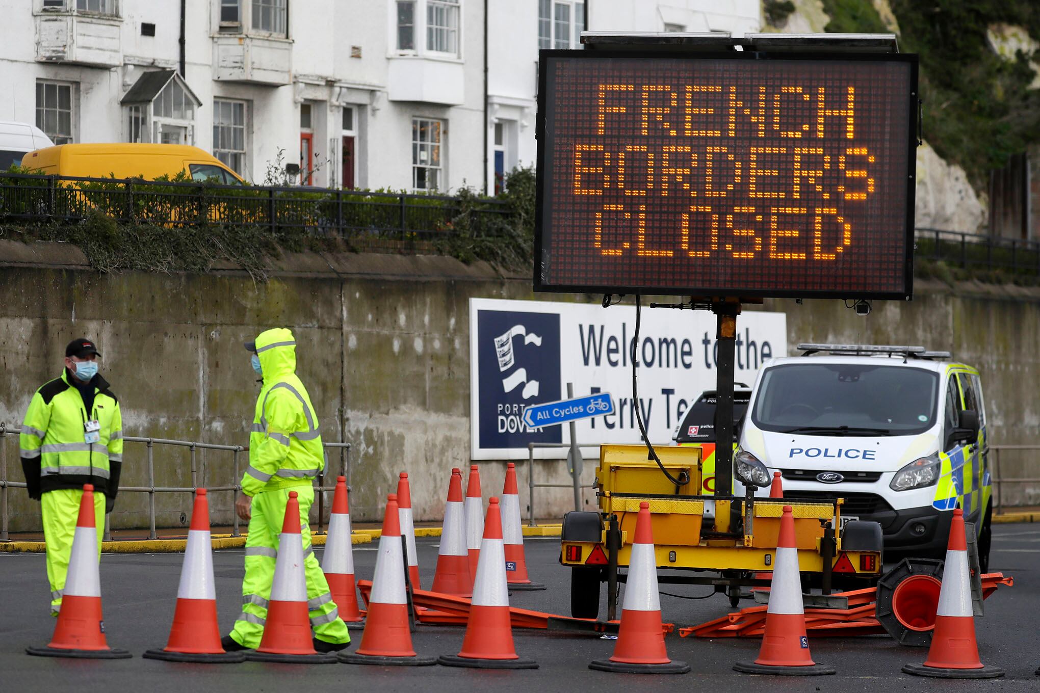 Foto: APAgentes de seguridad vigilan la entrada al check-in del ferry mientras el puerto de Dover permanece cerrado, el principal enlace de ferry entre el sur de Inglaterra y Francia. Foto: AP / Kirsty Wigglesworth.