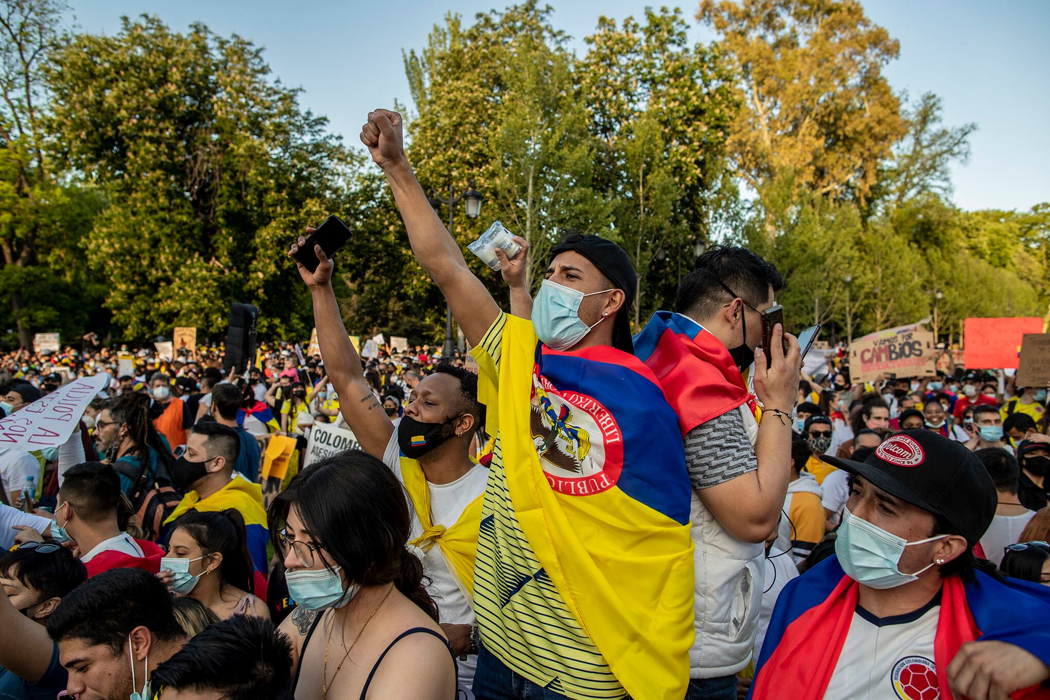 Foto: APLa gente se reúne durante una protesta contra la violencia que está sucediendo en Colombia contra la reforma fiscal en Madrid, España, el jueves 6 de mayo de 2021. Foto: AP / Manu Fernández.