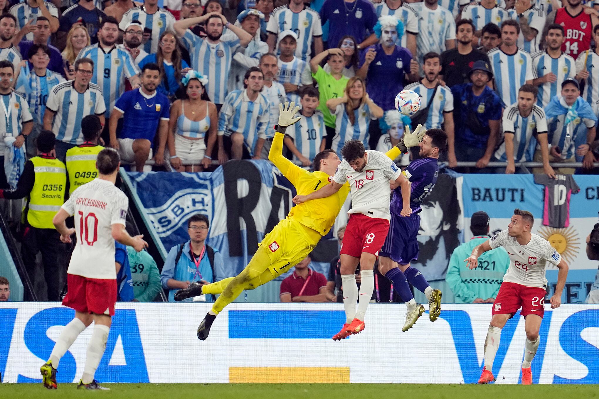 El portero de Polonia Wojciech Szczesny (1) salta por el balón contra Lionel Messi de Argentina y Bartosz Bereszyski de Polonia durante el partido de fútbol del Grupo C de la Copa Mundial entre Polonia y Argentina en el Estadio 974 en Doha, Qatar, miércoles 30 de noviembre de 2022.