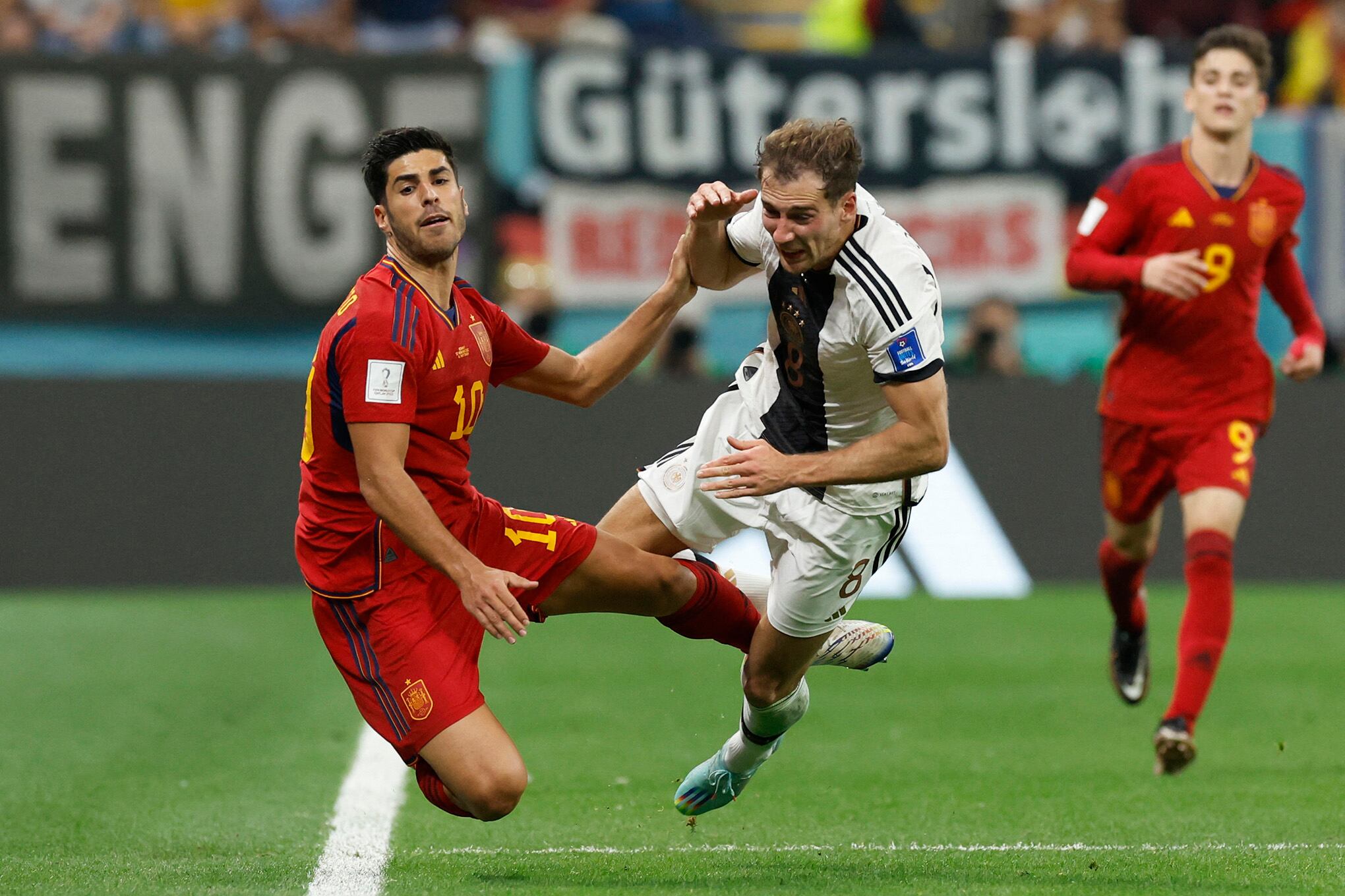 El español Marco Asensio recibe una falta del alemán Leon Goretzka, partido Grupo E - España contra Alemania - Estadio al Bayt, al Khor, Qatar - 27 de noviembre de 2022