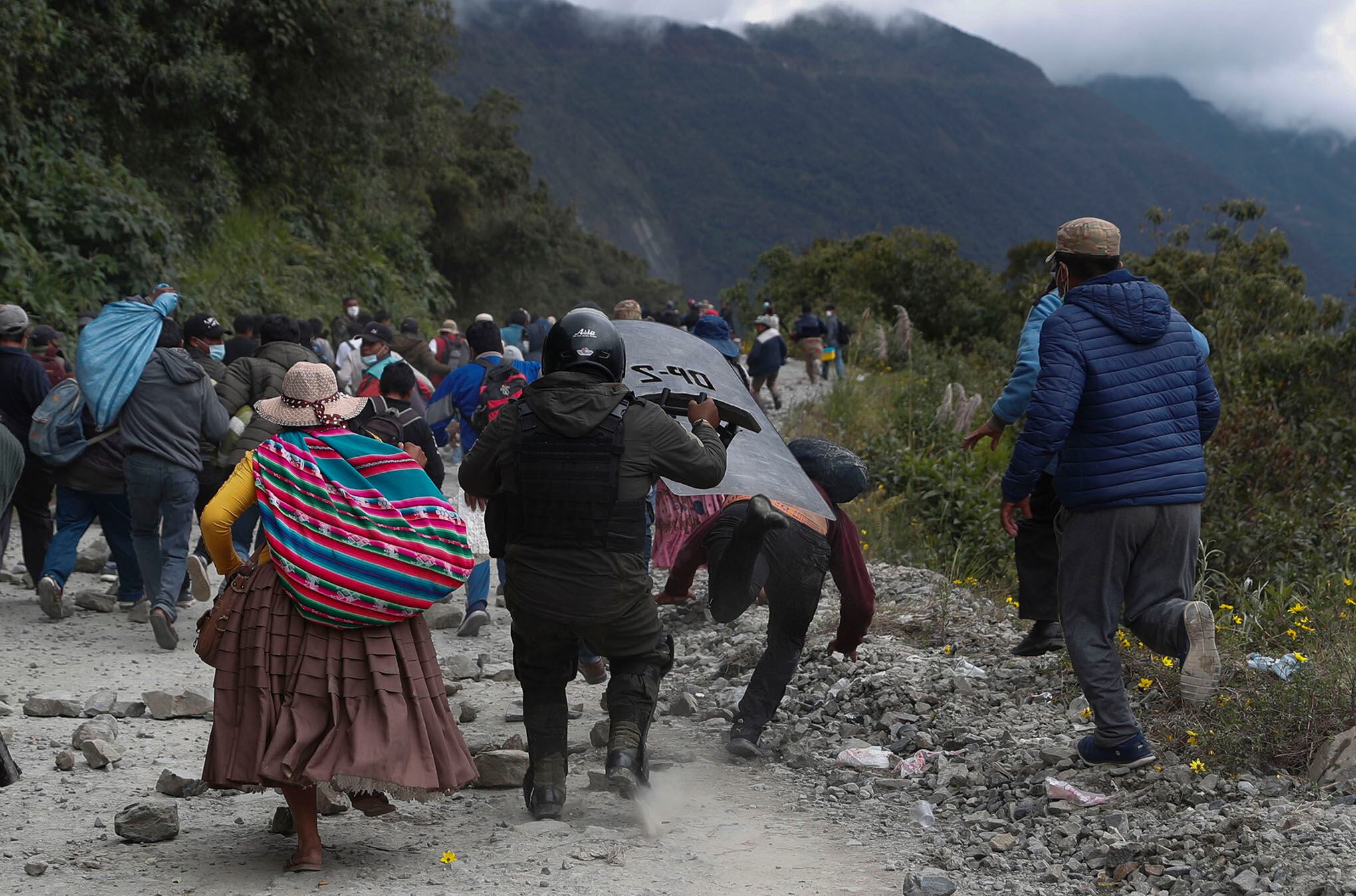 Foto: APLa policía despeja a los cultivadores de coca que protestaban contra el gobierno de Luis Arce, en Unduavi, Bolivia, el martes 16 de marzo de 2021. Los agricultores bloqueaban el tráfico entre la ciudad de La Paz y los Yungas, protestando por la reubicación del mercado legal de coca. y rechazar una sentencia judicial que reconoce a Elena Flores, a quien acusan de leal al gobierno del presidente Arce, como líder de la Asociación de Productores de Coca. Foto: AP / Juan Karita.