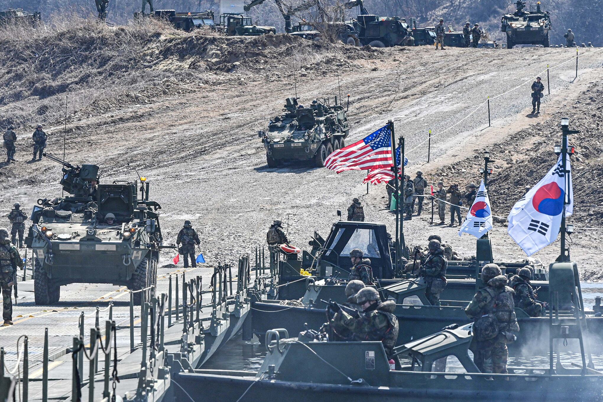 Soldados surcoreanos participan en un simulacro conjunto de cruce de río que forma parte del ejercicio militar conjunto Freedom Shield entre EE. UU. y Corea del Sur, cerca de la zona desmilitarizada que separa las dos Coreas, en Yeoncheon, Corea del Sur.