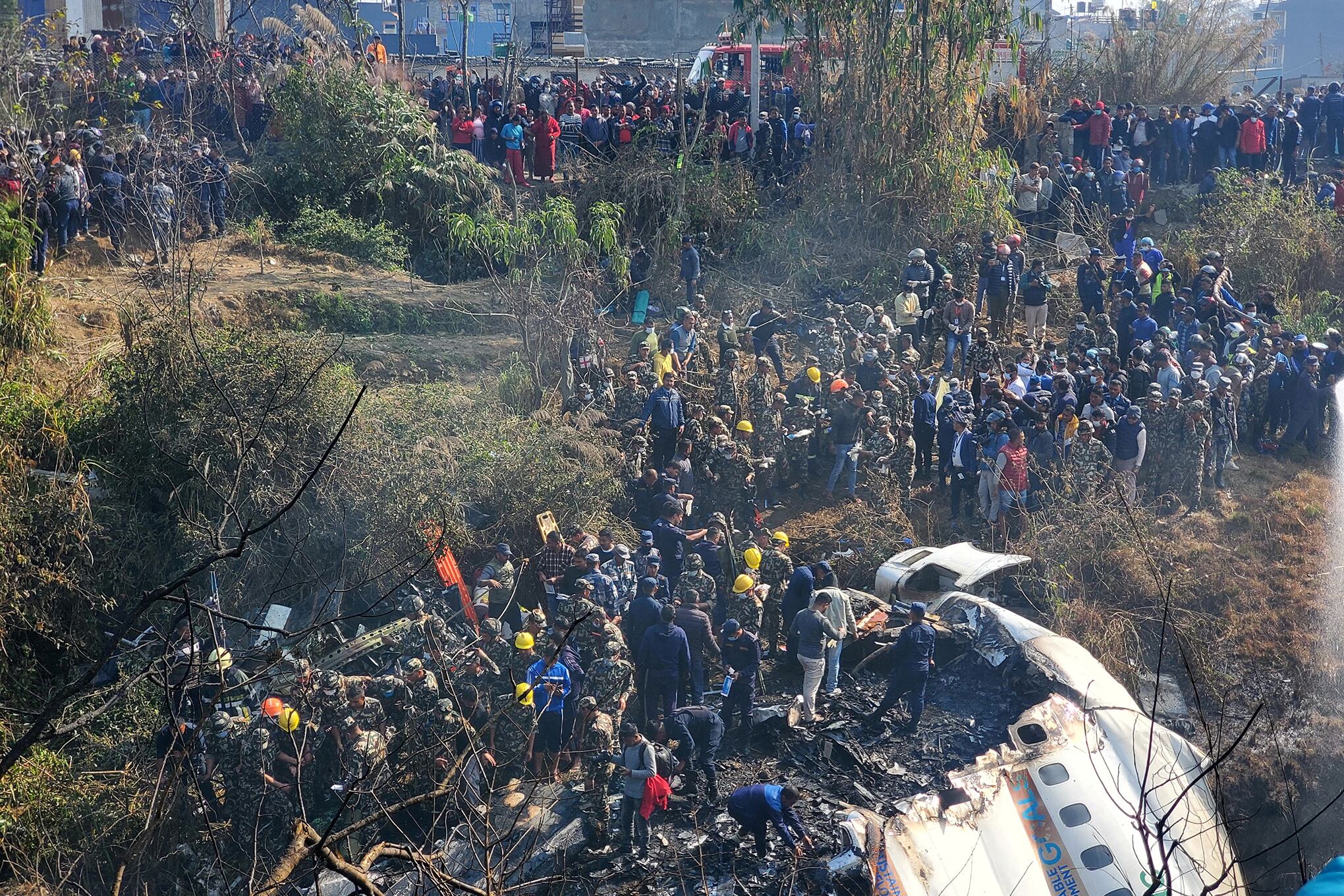 Los equipos de rescate trabajan para recuperar cuerpos de los restos del accidente de un avión operado por Yeti Airlines, en Pokhara, Nepal, 16 de enero de 2023.