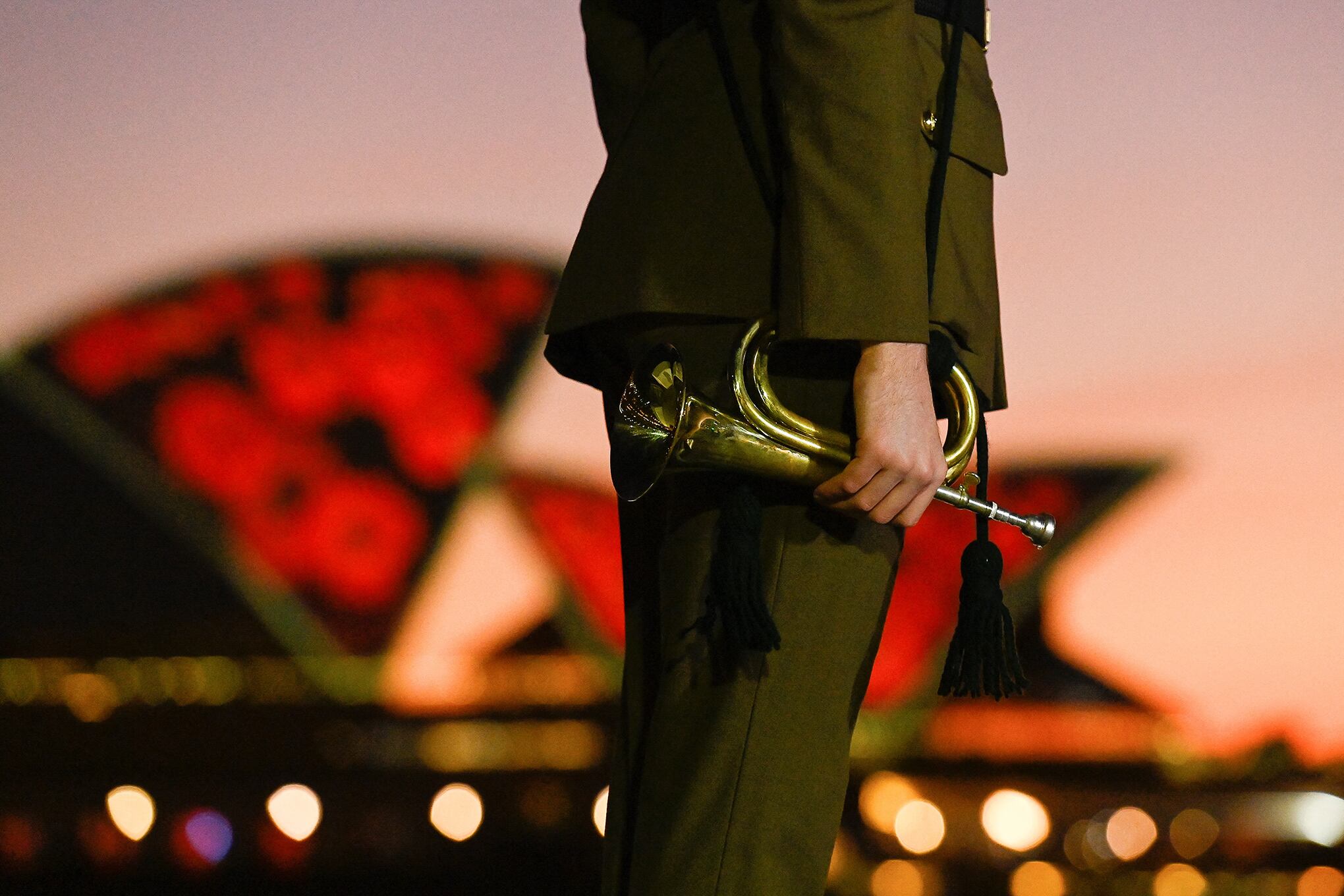 Un hombre sostiene una corneta frente a las velas de la Ópera de Sydney que se ilumina con amapolas al amanecer para conmemorar el Día del Recuerdo en Sydney, Australia, el 11 de noviembre de 2022.