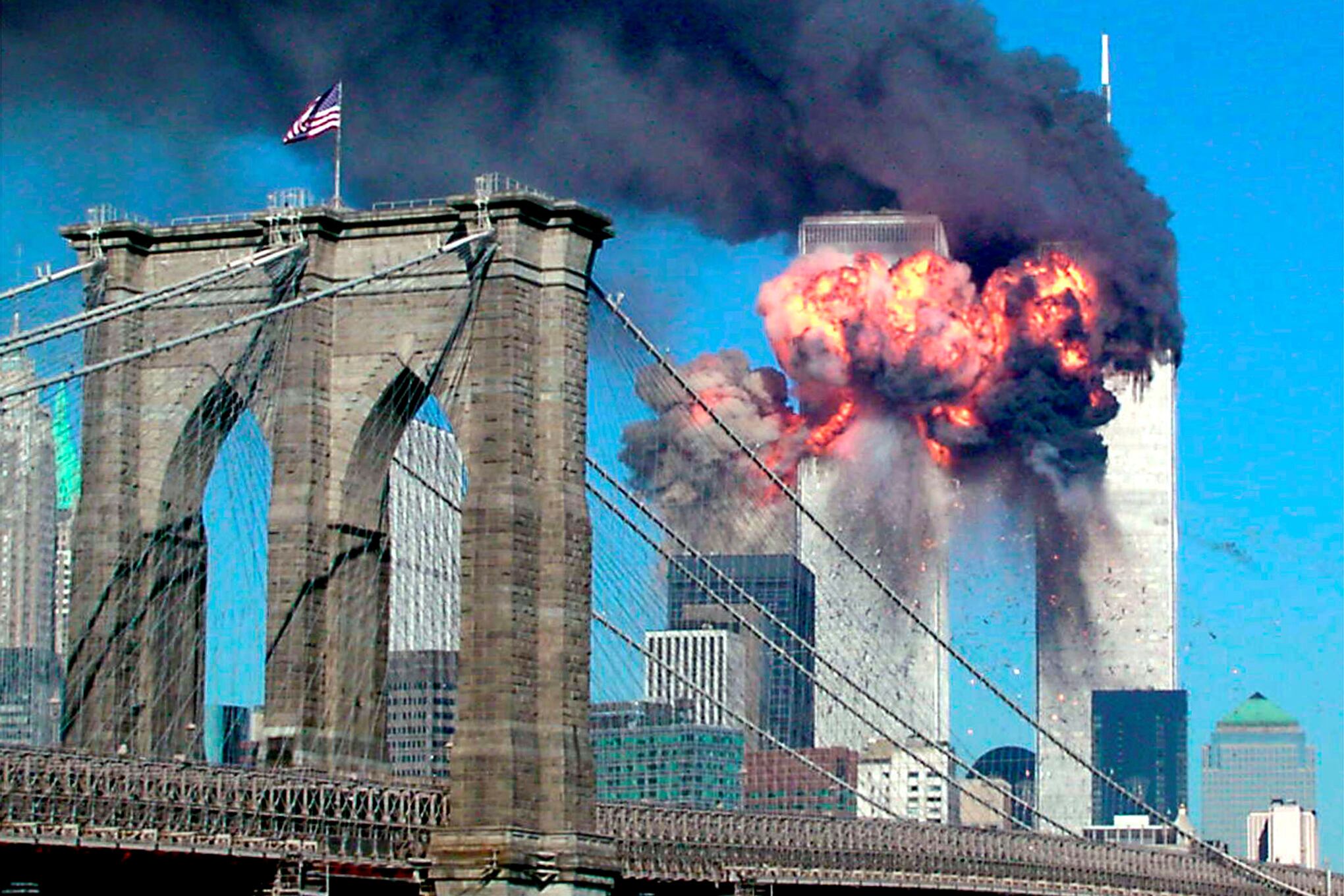 La segunda torre del World Trade Center estalla en llamas después de ser golpeada por un avión secuestrado en Nueva York, EE. UU., 11 de septiembre de 2001. El puente de Brooklyn se ve en primer plano. Foto: Reuters / Sara K. Schwittek.