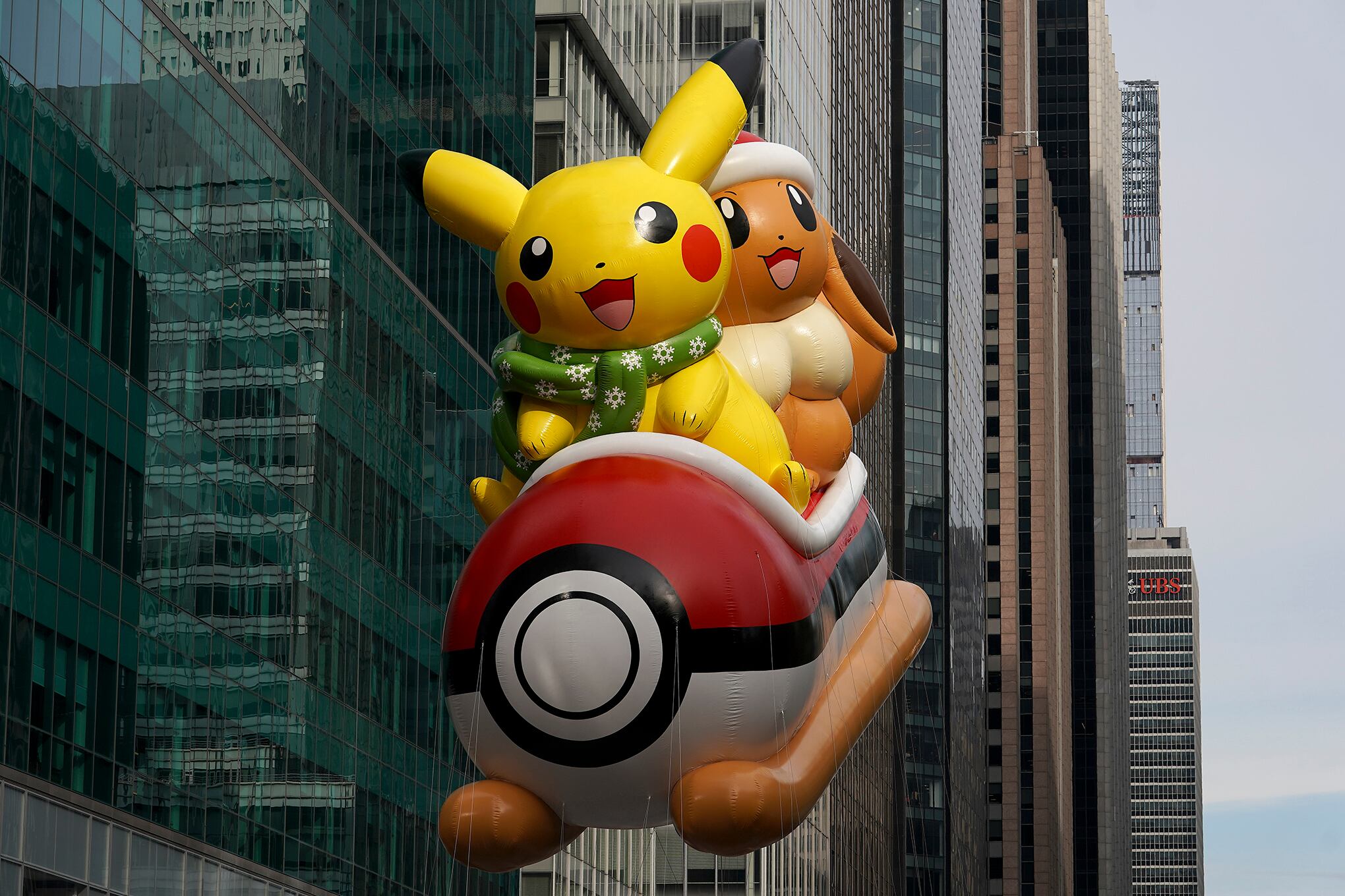 El globo de Pikachu y Eevee flota por la Sexta Avenida durante el desfile del Día de Acción de Gracias de Macy's, el jueves 25 de noviembre de 2021, en Nueva York. Foto: AP / Jeenah Moon.