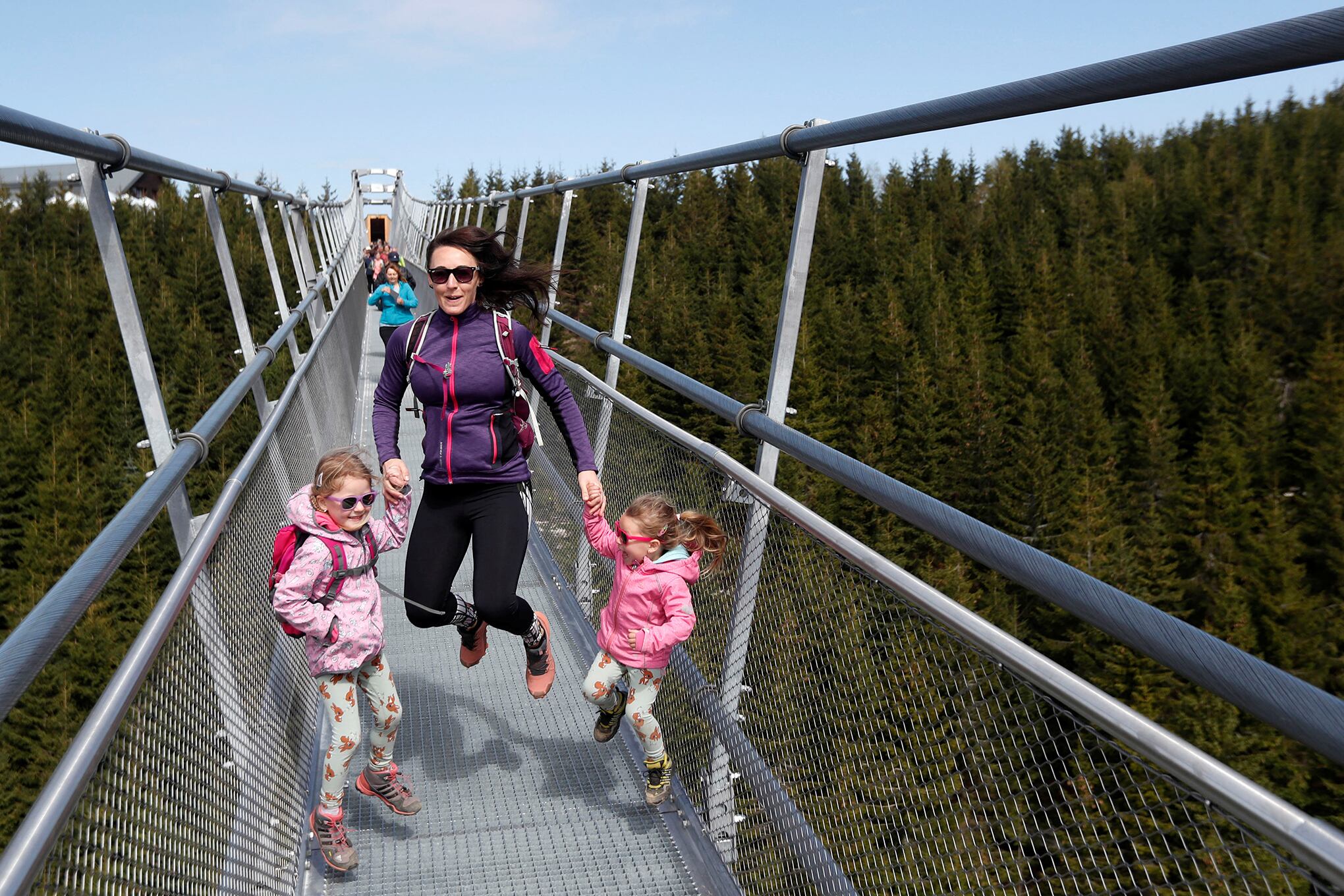 La gente camina por el puente colgante más largo del mundo recién construido después de su inauguración oficial en el complejo montañoso de Dolni Morava, República Checa, el 13 de mayo de 2022. Foto REUTERS/David W. Cerny