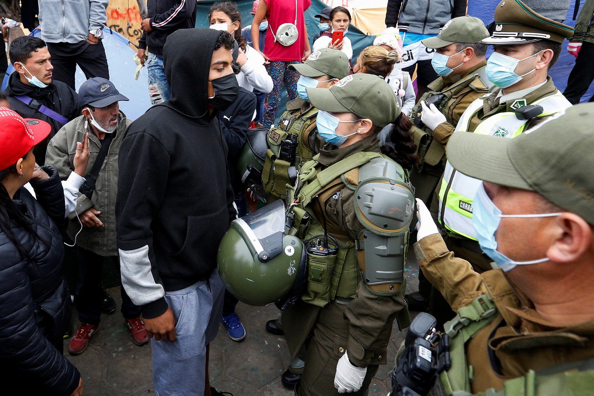 Migrantes venezolanos chocan con la policía mientras son desalojados de su campamento, instalado en una plaza pública, en Iquique, Chile, el 24 de septiembre de 2021. Foto REUTERS / Alex Diaz.