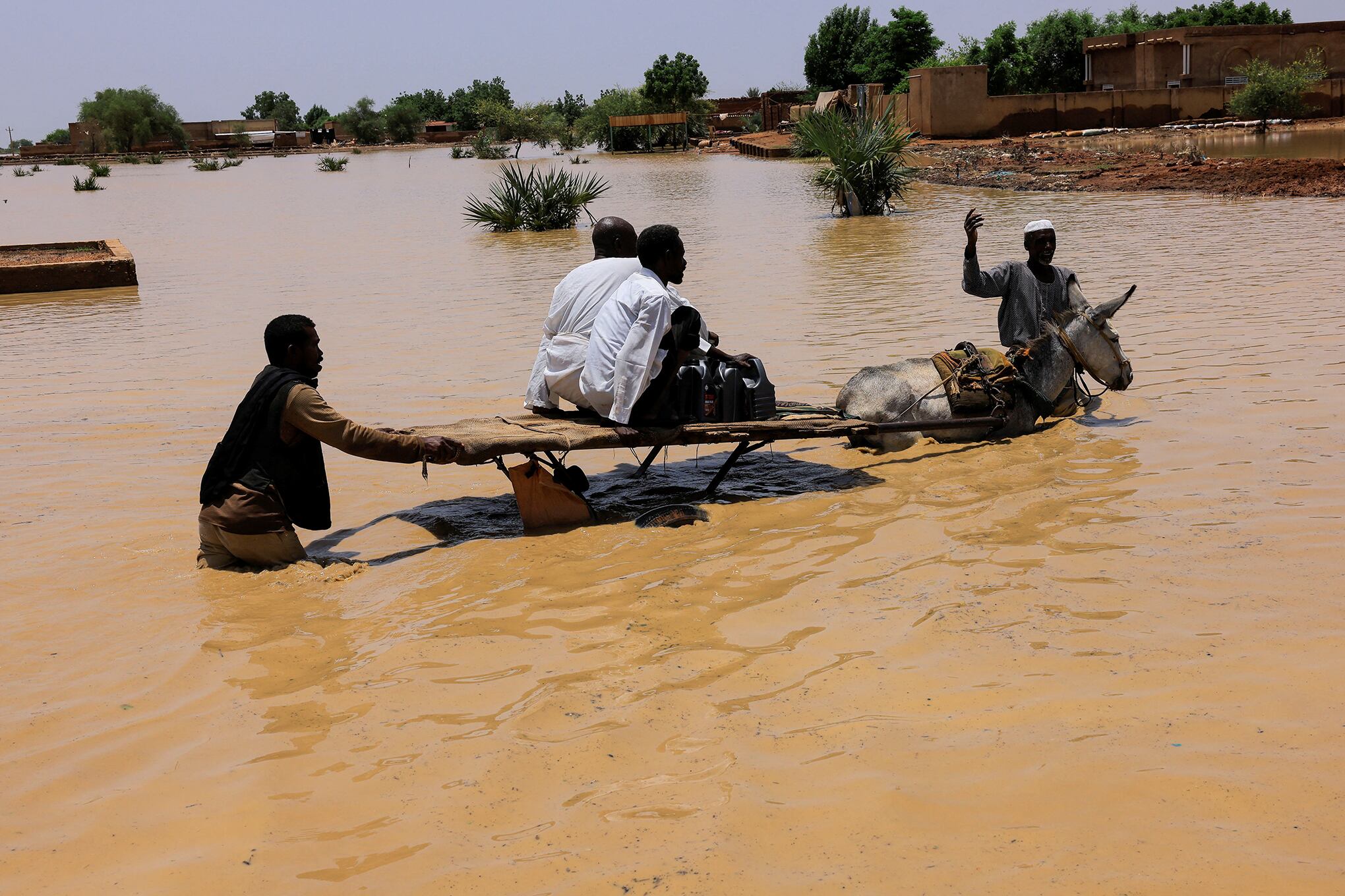 La gente viaja en un carro tirado por burros para cruzar el agua durante la inundación en la localidad de Al-Managil en el estado de Jazeera, Sudán, el 23 de agosto de 2022. Foto REUTERS/Mohamed Nureldin Abdallah
