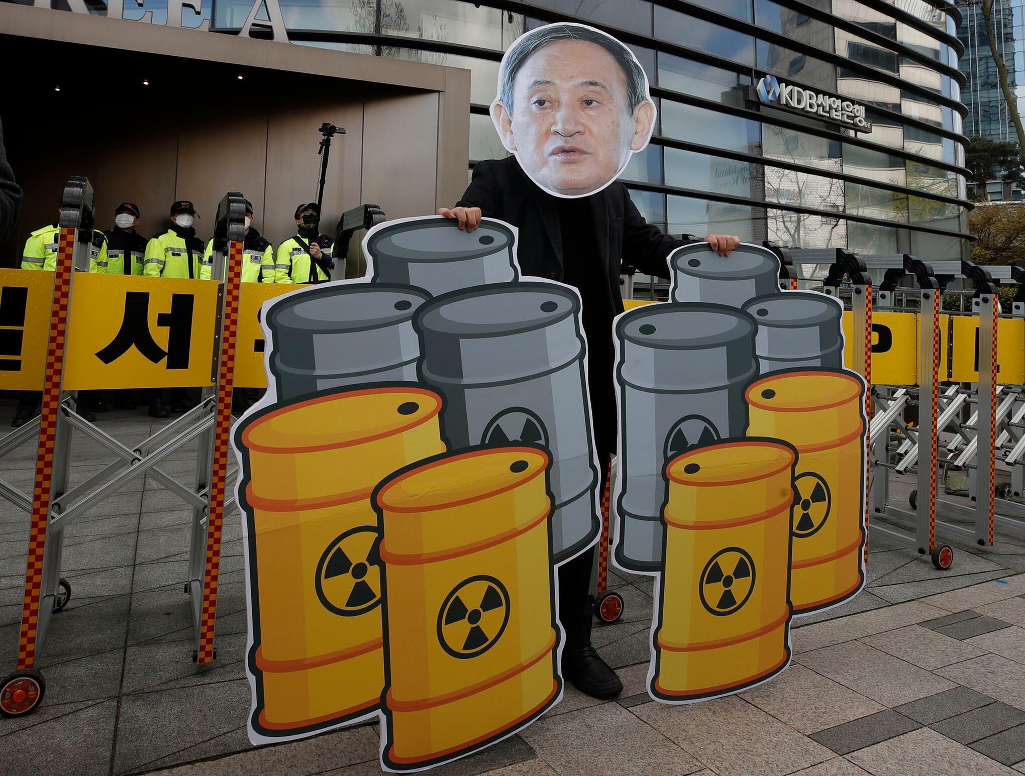 Foto: APUn miembro de grupos de jóvenes con un recorte del primer ministro japonés Yoshihide Suga actúa para denunciar la decisión de su gobierno, en Seúl, Corea del Sur, el martes 13 de abril de 2021.El gobierno de Japón decidió el martes comenzar a liberar cantidades masivas de agua radiactiva tratada de los restos del naufragio. La planta nuclear de Fukushima en el Océano Pacífico en dos años, una opción a la que se oponen ferozmente los pescadores y residentes locales. Foto: AP / Lee Jin-man.