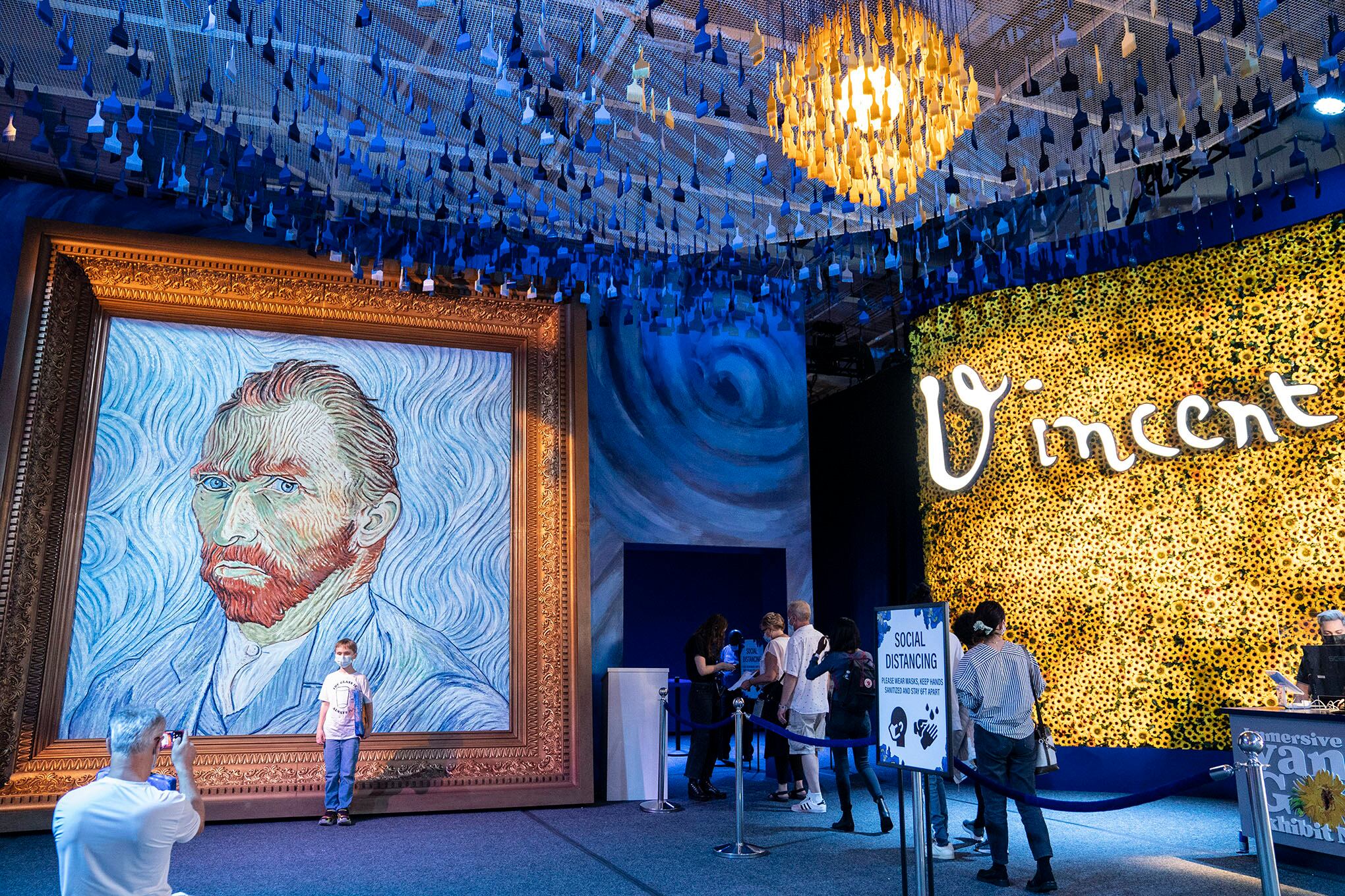 Foto: APLos invitados llegan junto a una réplica gigante del autorretrato del célebre pintor Vincent Van Gogh durante una vista previa de la exhibición Immersive Van Gogh en Pier 36, de junio de 2021, en Nueva York. Foto: AP / John Minchillo.