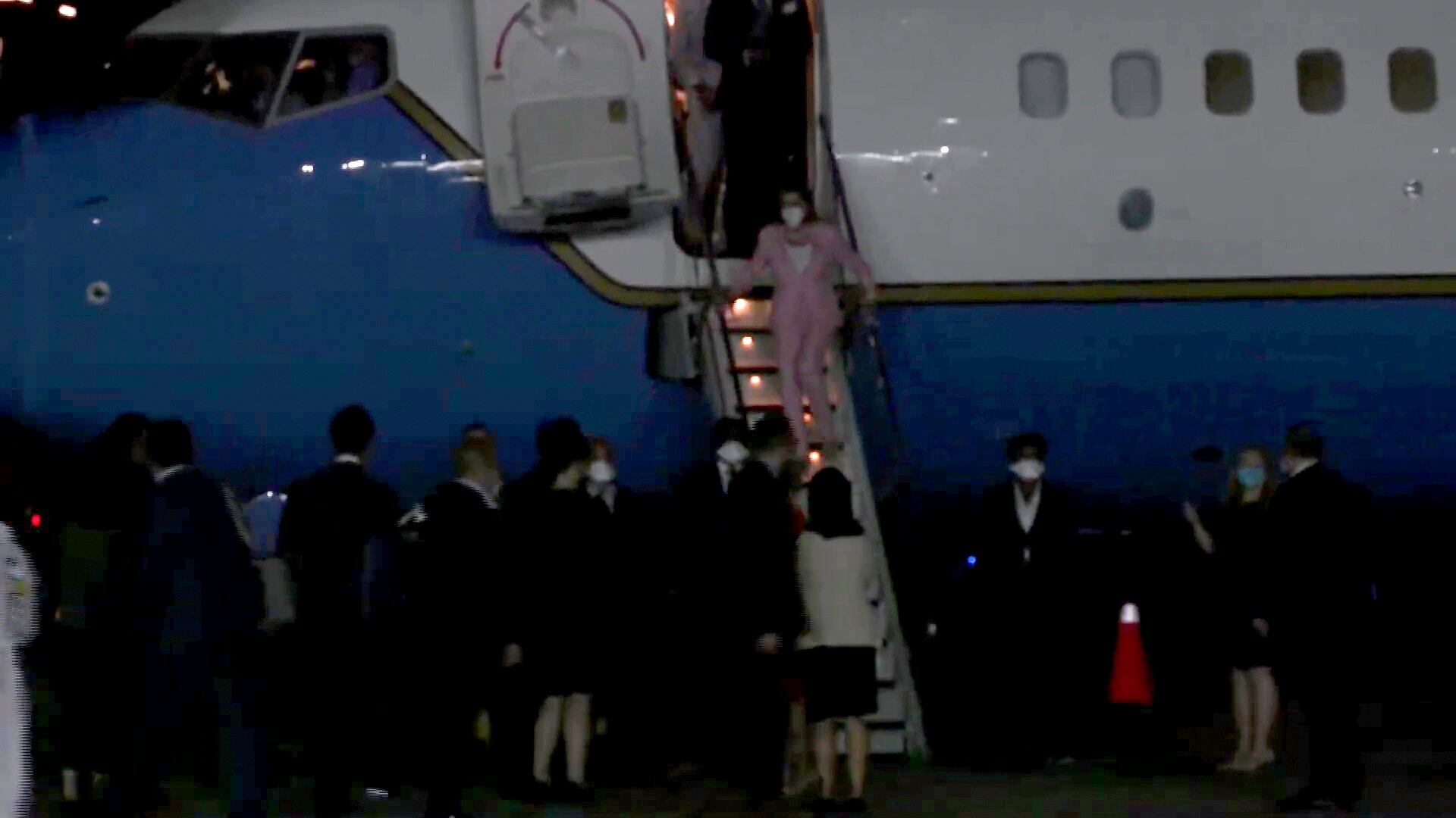 Imagen del momento en que la funcionaria estadounidense desciende de su avión en el aeropuerto de Taipéi, capital de Taiwán. Foto Getty Images