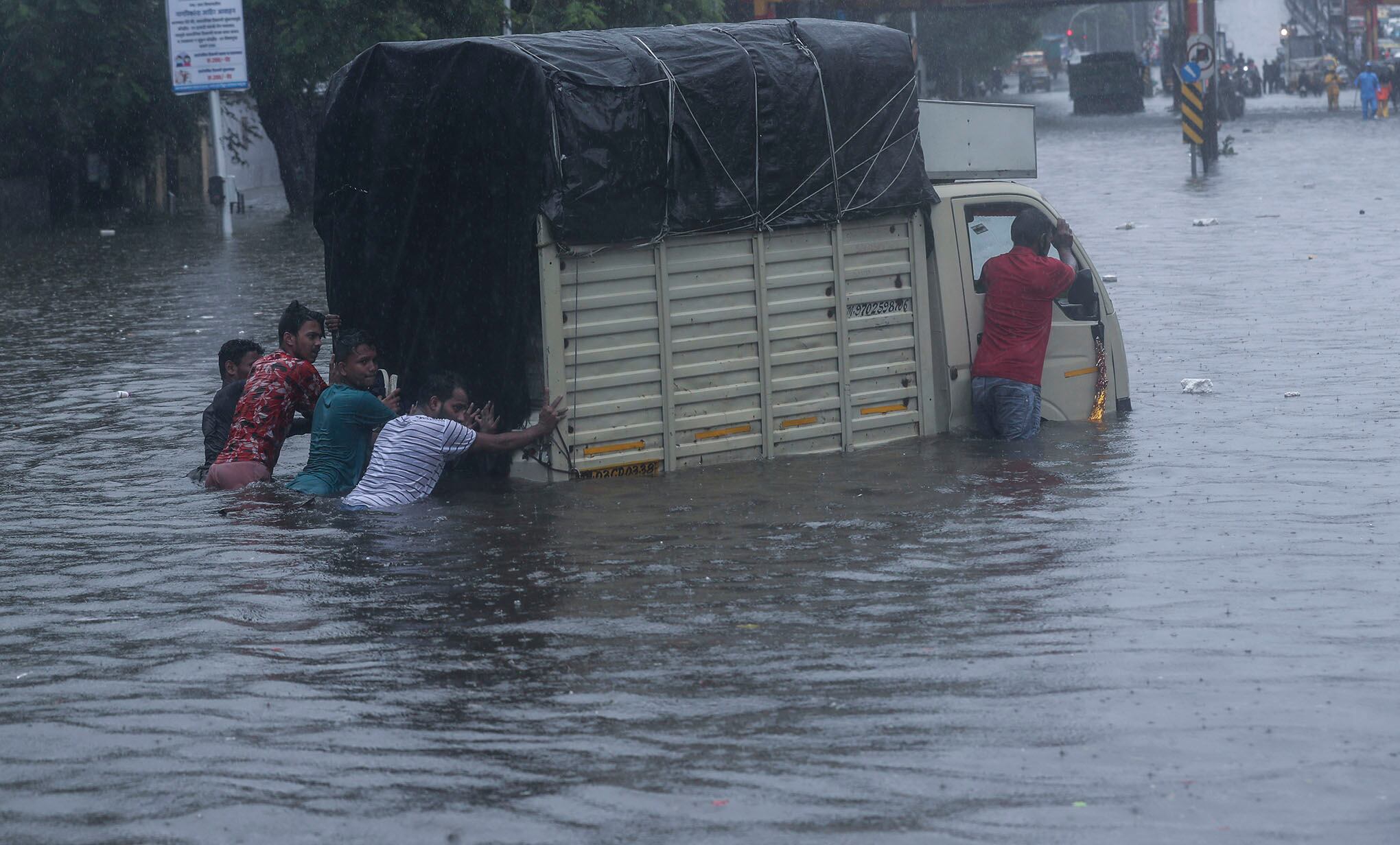 Foto: APLa gente empuja una mini camioneta a través de una calle inundada durante las fuertes lluvias en Mumbai, India, el miércoles 9 de junio de 2021 Foto: AP / Rafiq Maqbool.