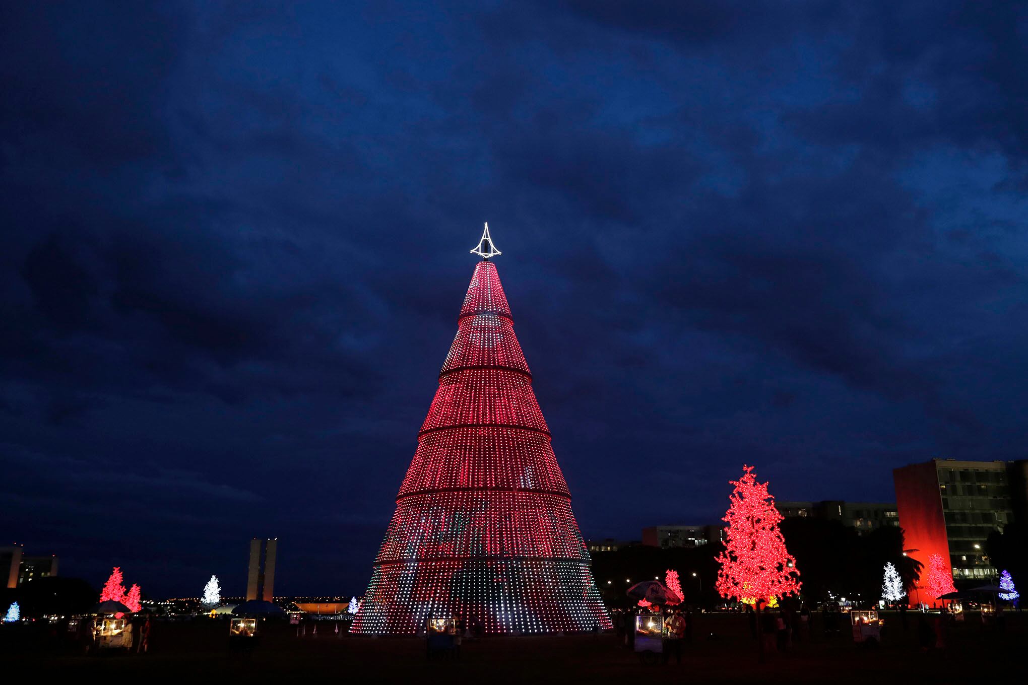 Foto: APLas nubes se acumulan sobre la Explanada de los Ministerios que está iluminada con luces y un gran árbol de Navidad en medio de la nueva pandemia de coronavirus, en Brasilia, Brasil, el lunes 21 de diciembre de 2020. Foto: AP / Eraldo Peres.