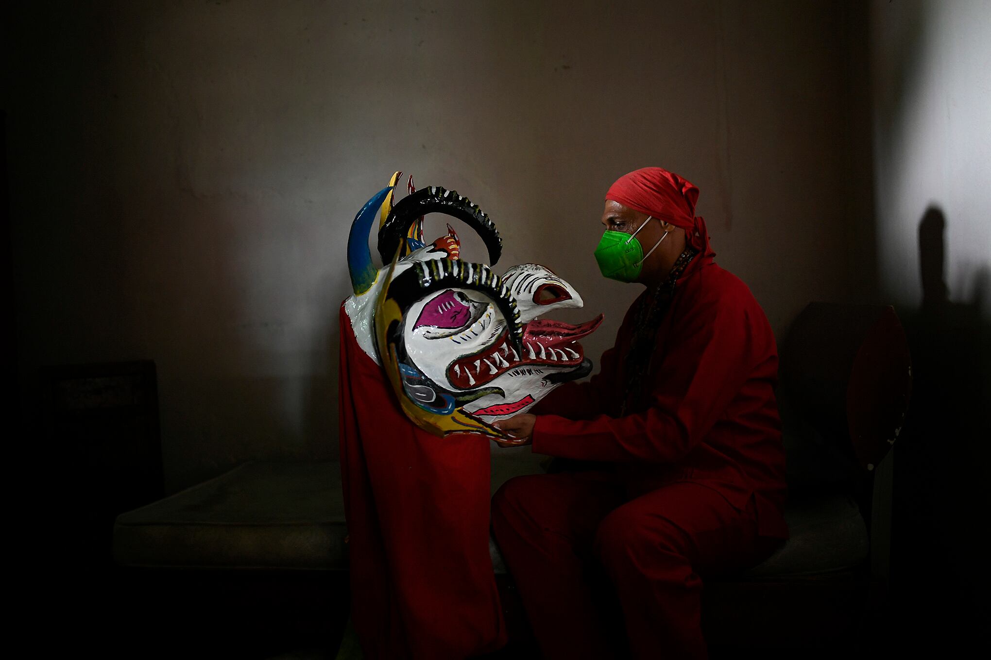 Foto: APUn hombre sostiene su máscara de diablo mientras se prepara para participar en las celebraciones del Corpus Christi en San Francisco de Yare, Venezuela, el jueves 3 de junio de 2021, en medio de la pandemia de coronavirus. El baile de carnaval, en el que los demonios pagan penitencia y piden alivio de las dolencias físicas, simboliza la lucha en curso entre el bien y el mal. La tradición se remonta a 1742, cuando los sacerdotes liberales de Venezuela la utilizaron para incluir a los esclavos africanos a los que no se les permitía adorar en la misma iglesia que sus amos blancos. Foto: AP / Matias Delacroix.