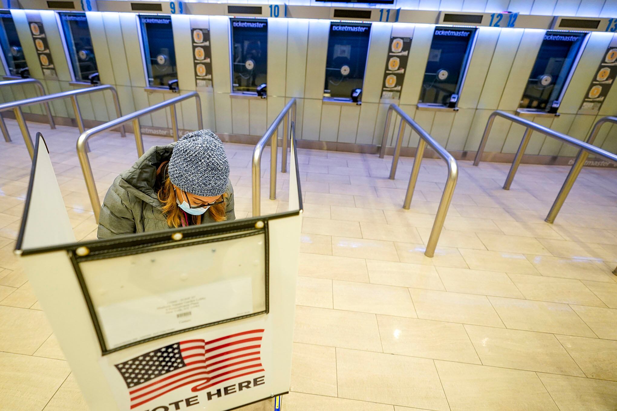 Foto: APUna votante marca su boleta durante la primera hora de votación en Nueva York en el Madison Square Garden, el martes 3 de noviembre de 2020. Foto: AP / Mary Altaffer.