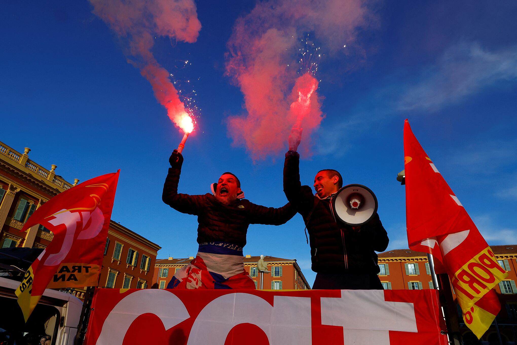 Los manifestantes sostienen bengalas durante una manifestación contra el plan de reforma de pensiones del gobierno francés en Saint-Nazaire como parte de un día de huelga nacional y protestas en Francia, el 19 de enero de 2023.