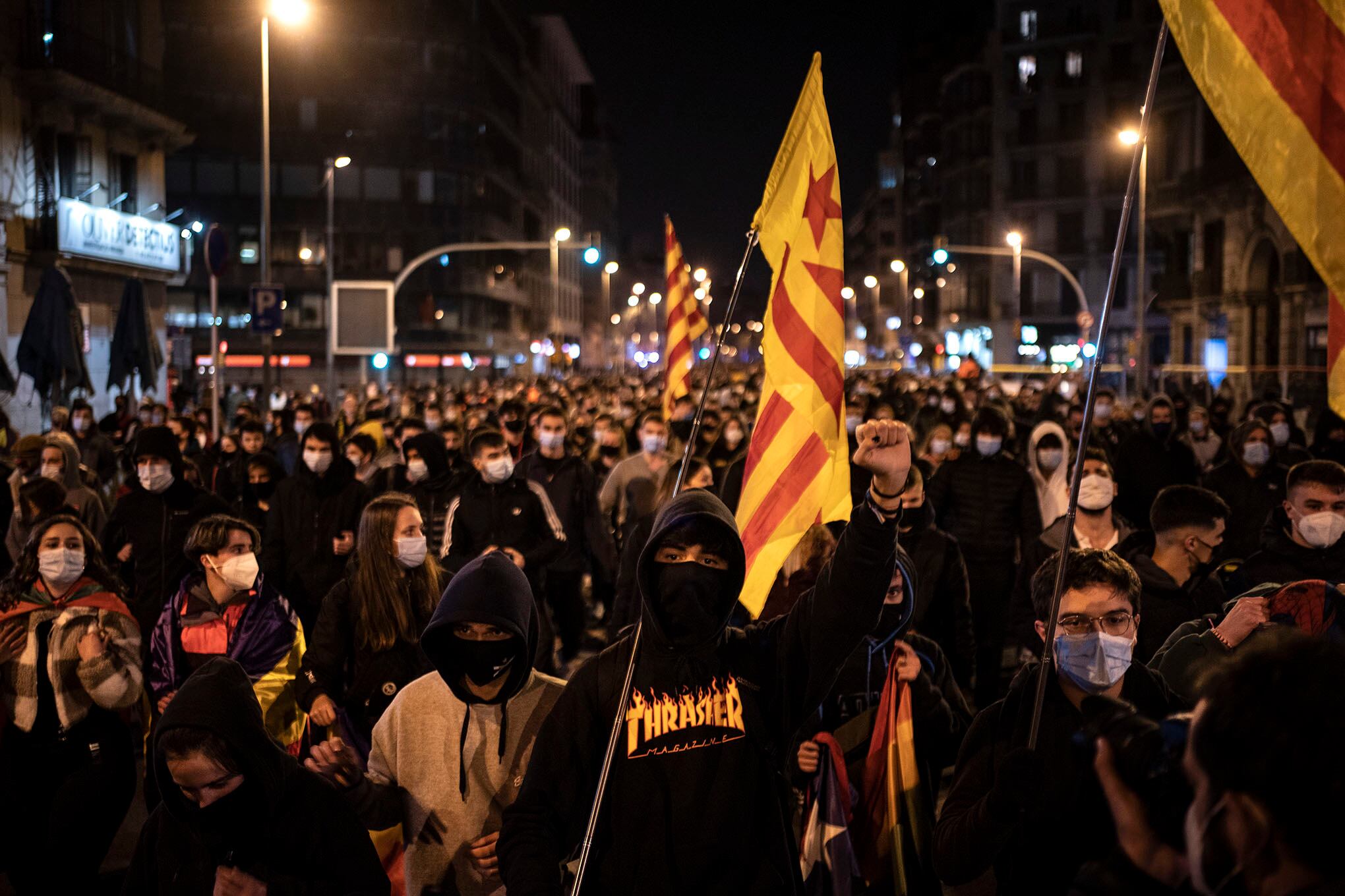 Foto: APLa gente marcha durante una protesta, condenando el arresto del artista de rap Pablo Hasél en Barcelona, España, el viernes 19 de febrero de 2021. El encarcelamiento de un artista de rap por su música, que alaba la violencia terrorista e insulta a la monarquía española, ha desatado una ola de rabia reprimida esta semana en España. La detención de Pablo Hasél ha sacado a miles a las calles por diferentes motivos. La mayoría marcha bajo la bandera de la libertad de expresión, pero las letras de Hasél también aprovechan un debate sobre el papel de la monarquía parlamentaria de España después de los escándalos financieros que involucran a la casa real. Foto: AP / Felipe Dana.