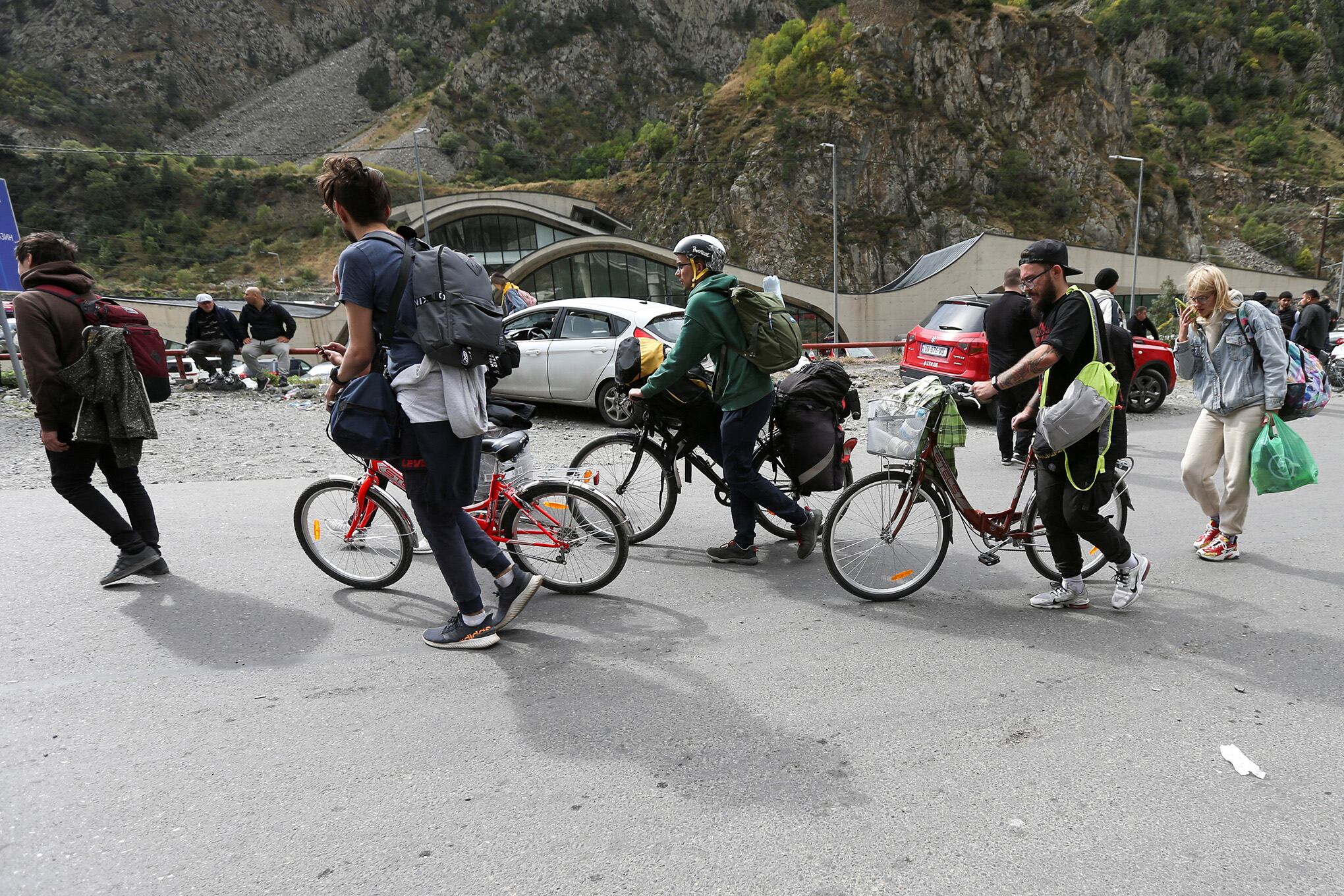 Los viajeros empujan bicicletas después de cruzar la frontera con Rusia en el puesto de control fronterizo Verkhny Lars - Zemo Larsi, Georgia 28 de septiembre de 2022.