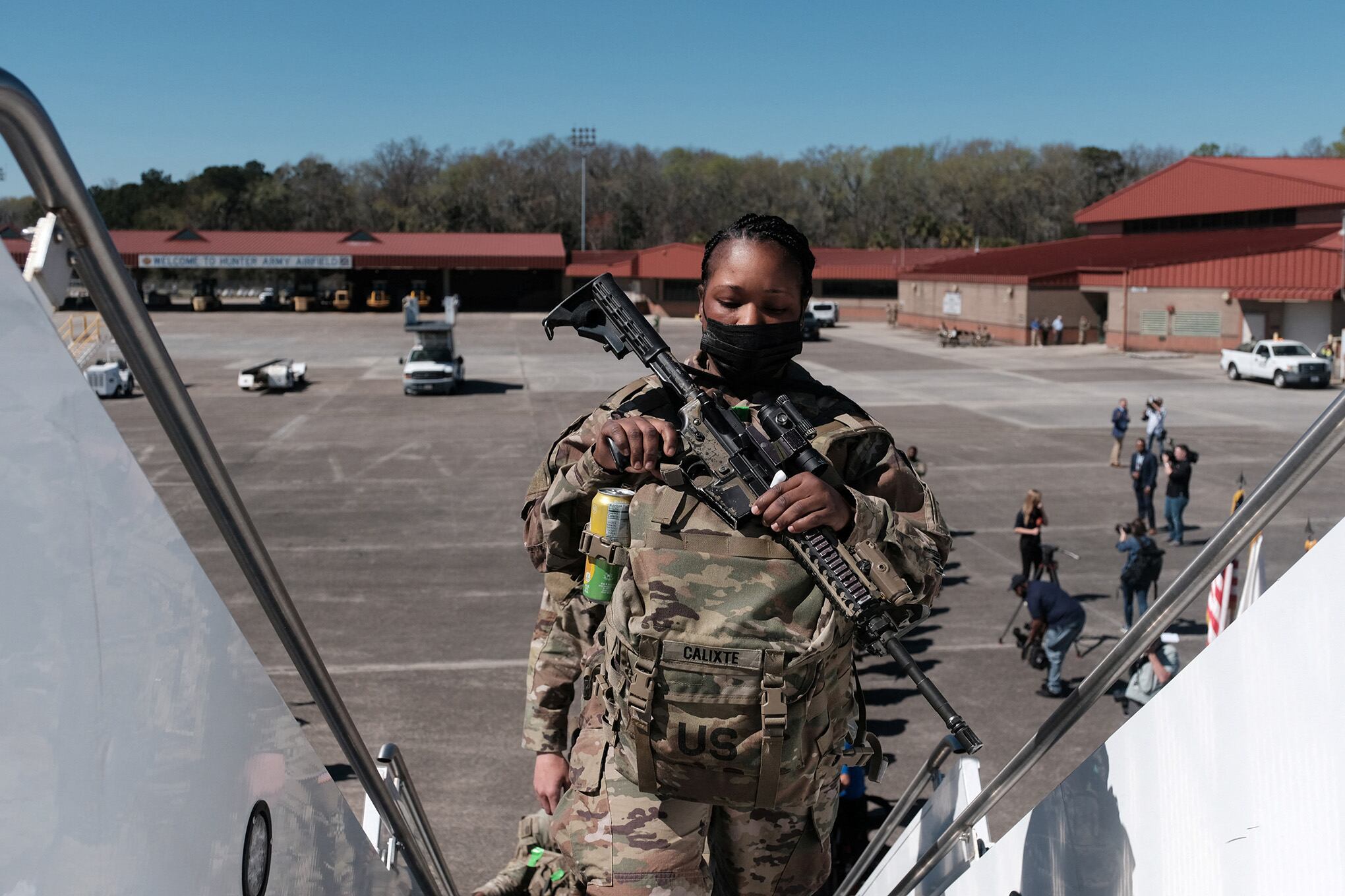 Soldados del Equipo de Combate de la 1.ª Brigada Blindada del Ejército de EE. UU. inspeccionan sus armas antes de abordar un avión de transporte con destino a Europa en un despliegue lanzado en respuesta a la invasión de Ucrania por Rusia, en el Aeródromo del Ejército de Hunter, Georgia, EE. UU., 2 de marzo de 2022. Foto REUTERS/ Michael A. McCoy
