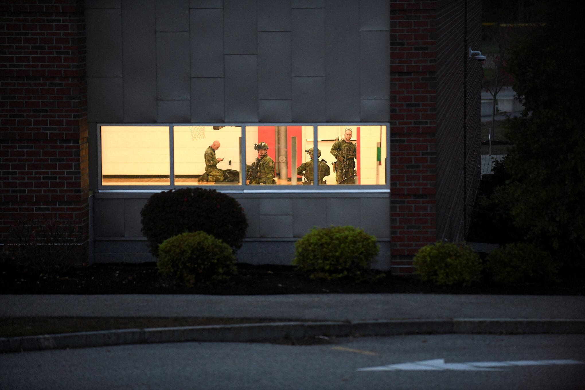 La policía, organizada en la escuela secundaria de Lisboa, sale del área mientras se lleva a cabo una búsqueda de un pistolero después de los mortales tiroteos masivos de Lewiston, en Lisboa, Maine, EE. UU., el 26 de octubre de 2023.