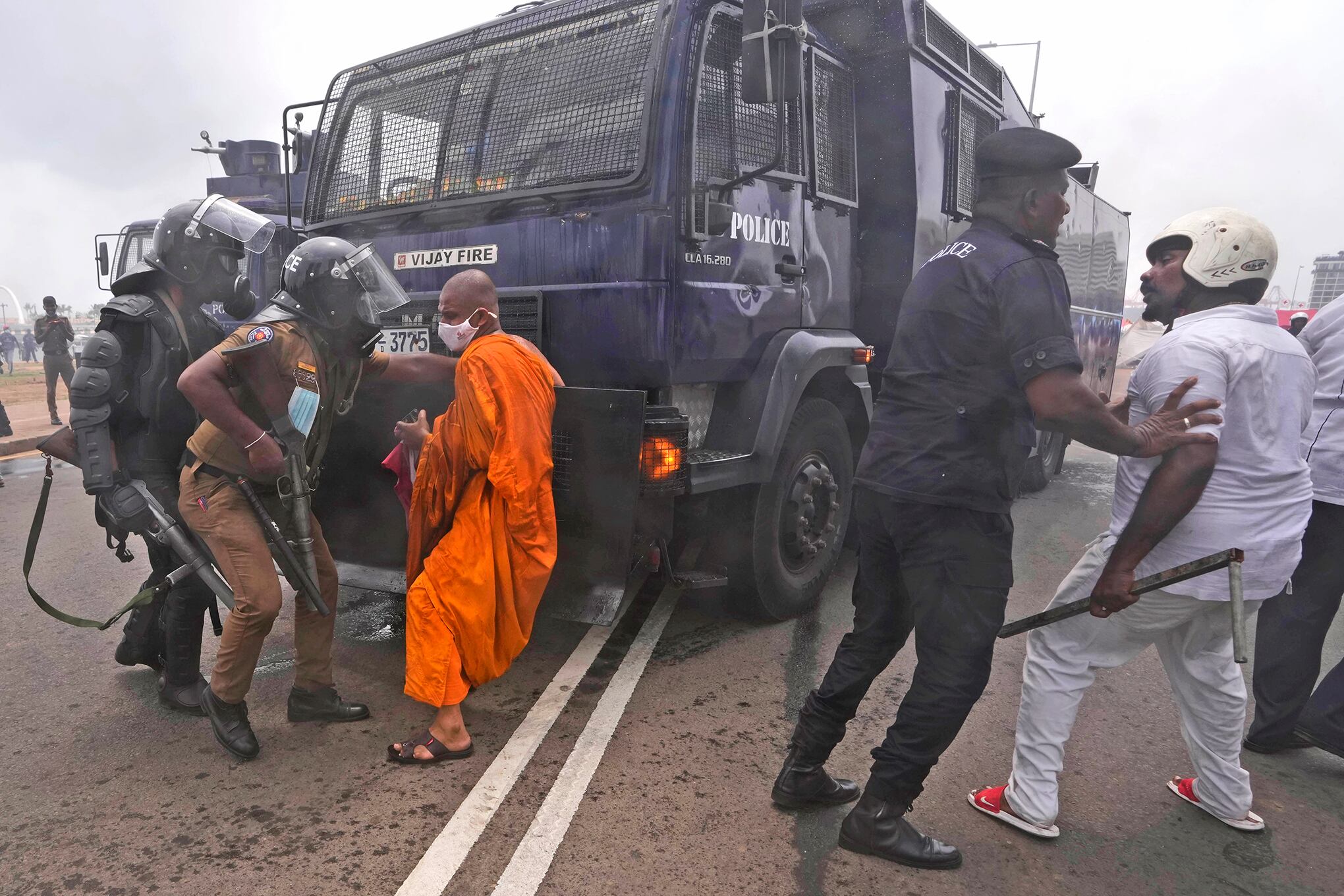 Partidarios del gobierno de Sri Lanka intentan bloquear un camión de agua de la policía durante un enfrentamiento con manifestantes antigubernamentales en Colombo, Sri Lanka, el lunes 9 de mayo de 2022. Foto AP/Eranga Jayawardena