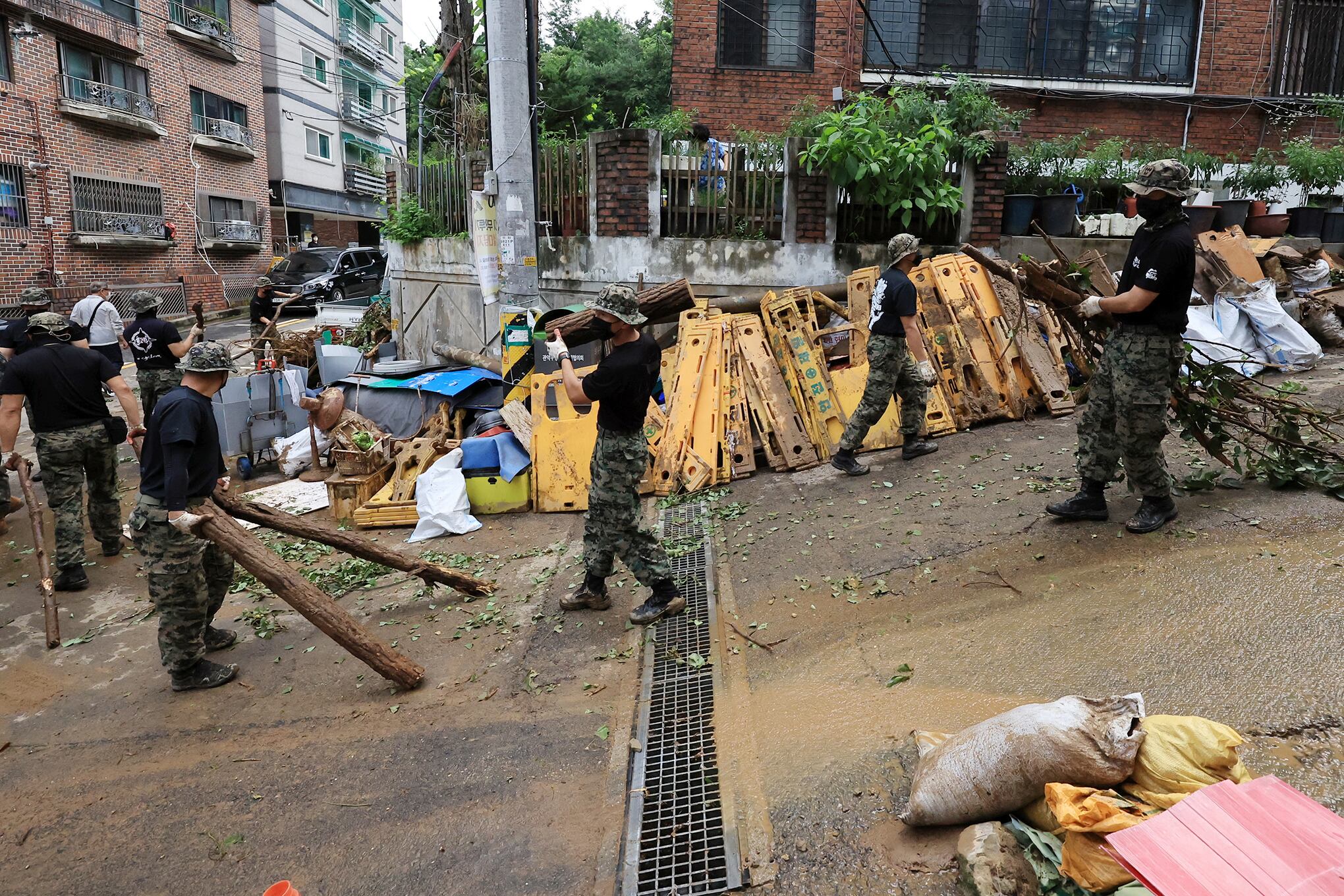 Soldados surcoreanos limpian los escombros de una calle que quedó sumergida tras una lluvia torrencial en Seúl, Corea del Sur, el 10 de agosto de 2022. Foto: Yonhap/vía Reuters