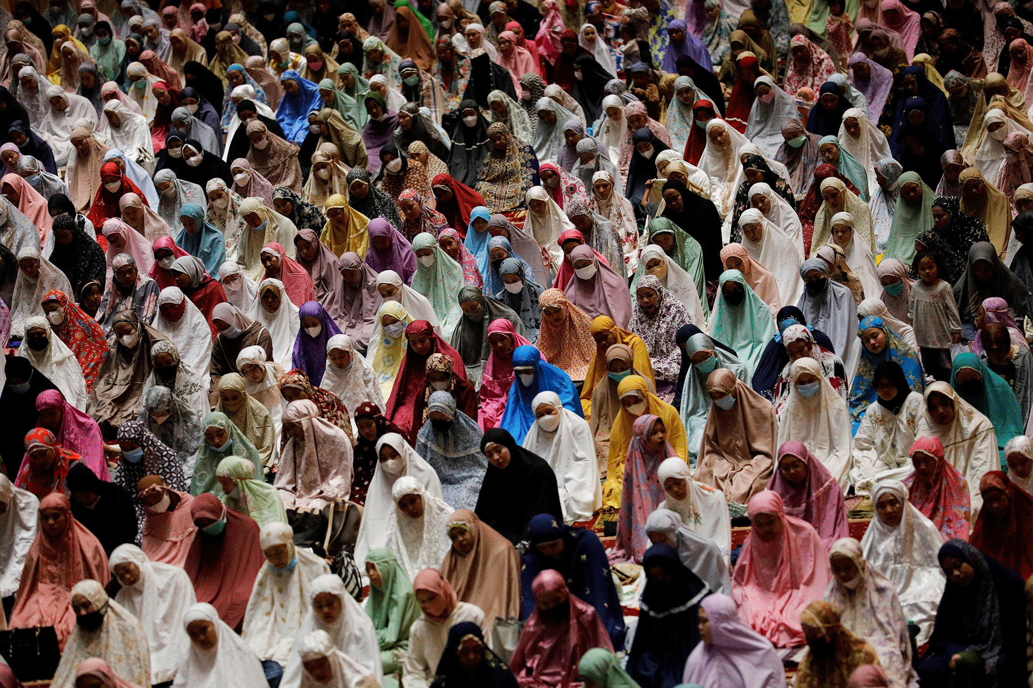 Las mujeres musulmanas ofrecen oraciones masivas vespertinas conocidas como 'Tarawih' durante la primera víspera del sagrado mes de ayuno del Ramadán en la Gran Mezquita de Istiqlal en Yakarta, Indonesia, el 2 de abril de 2022. Foto REUTERS/Willy Kurniawan
