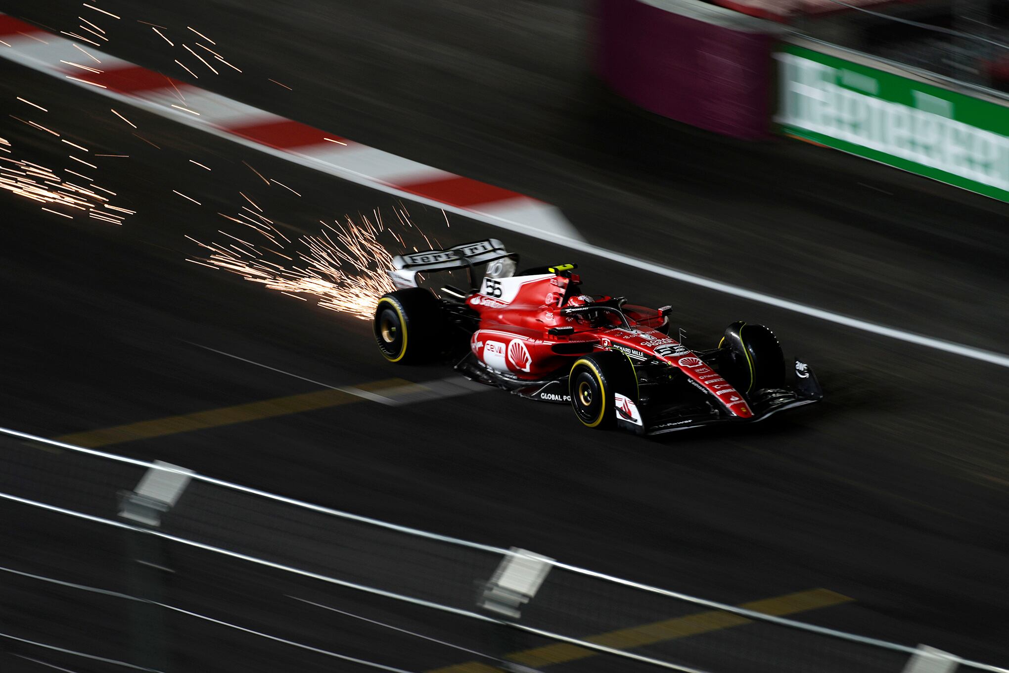El piloto de Ferrari Carlos Sainz, de España, conduce durante la segunda práctica de la carrera de autos del Gran Premio de Fórmula Uno de Las Vegas, el viernes 17 de noviembre de 2023, en Las Vegas.