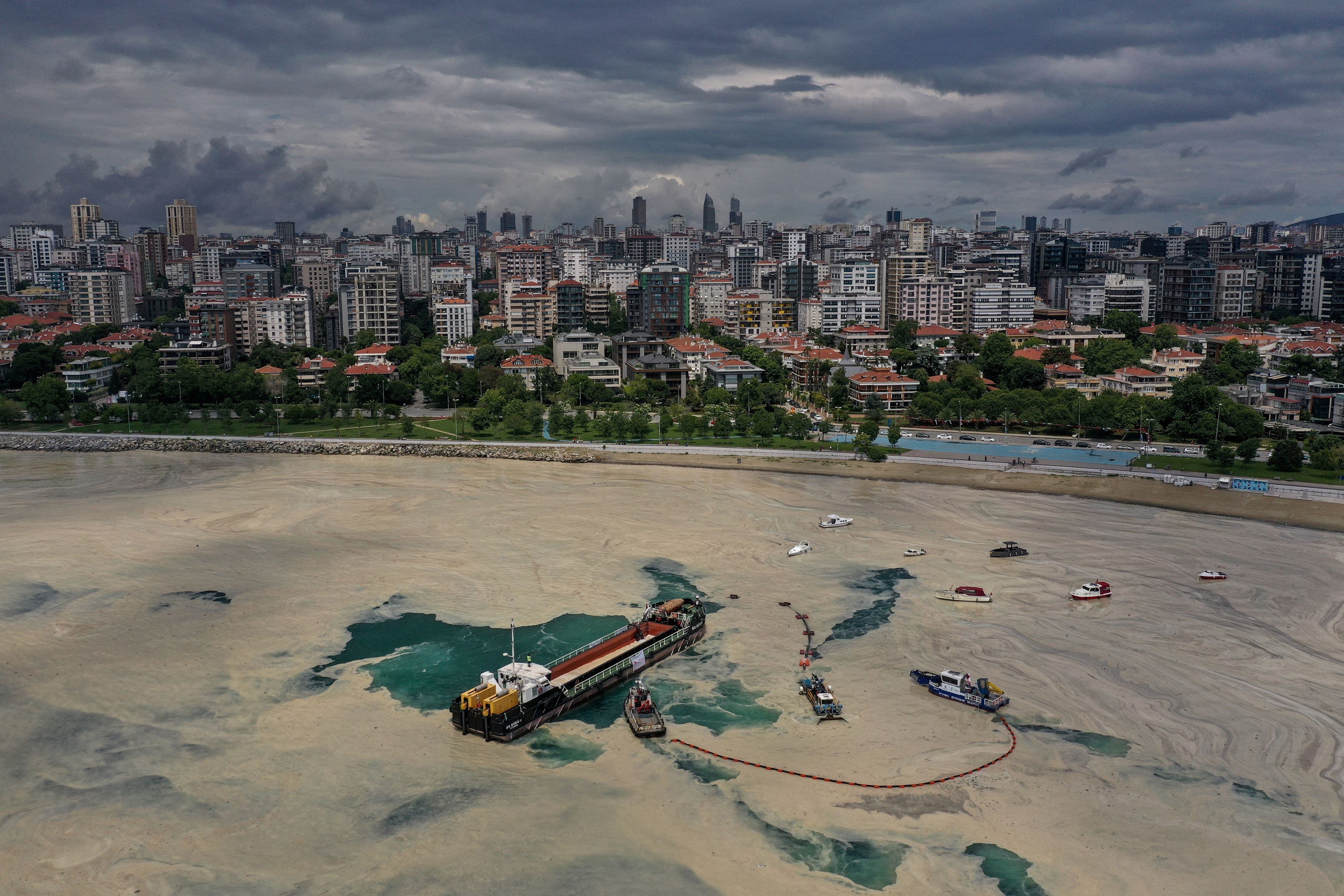 Los barcos de limpieza de la superficie del mar y los barcos que colocan barreras limpian los mocos marinos, una gruesa capa viscosa de materia orgánica también conocida como mucílago marino, que se esparce por el Mar de Mármara y amenaza la vida marina y la industria pesquera, en Estambul, Turquía Junio 15, 2021. Foto REUTERS/Umit Bektas Finalista del Premio Pulitzer de Fotografía de Largometrajes