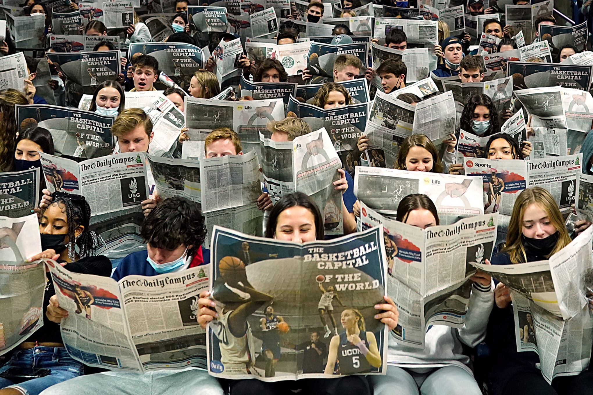 En Storrs, Connecticut (Estados Unidos), los fanáticos de los Connecticut Huskies ven un periódico en el que se presenta a los Grambling State Tigers antes del inicio del juego en Harry A. Gampel Pavilion. 4 de diciembre de 2021. Foto: Reuters / David Butler II - USA Today Sports.