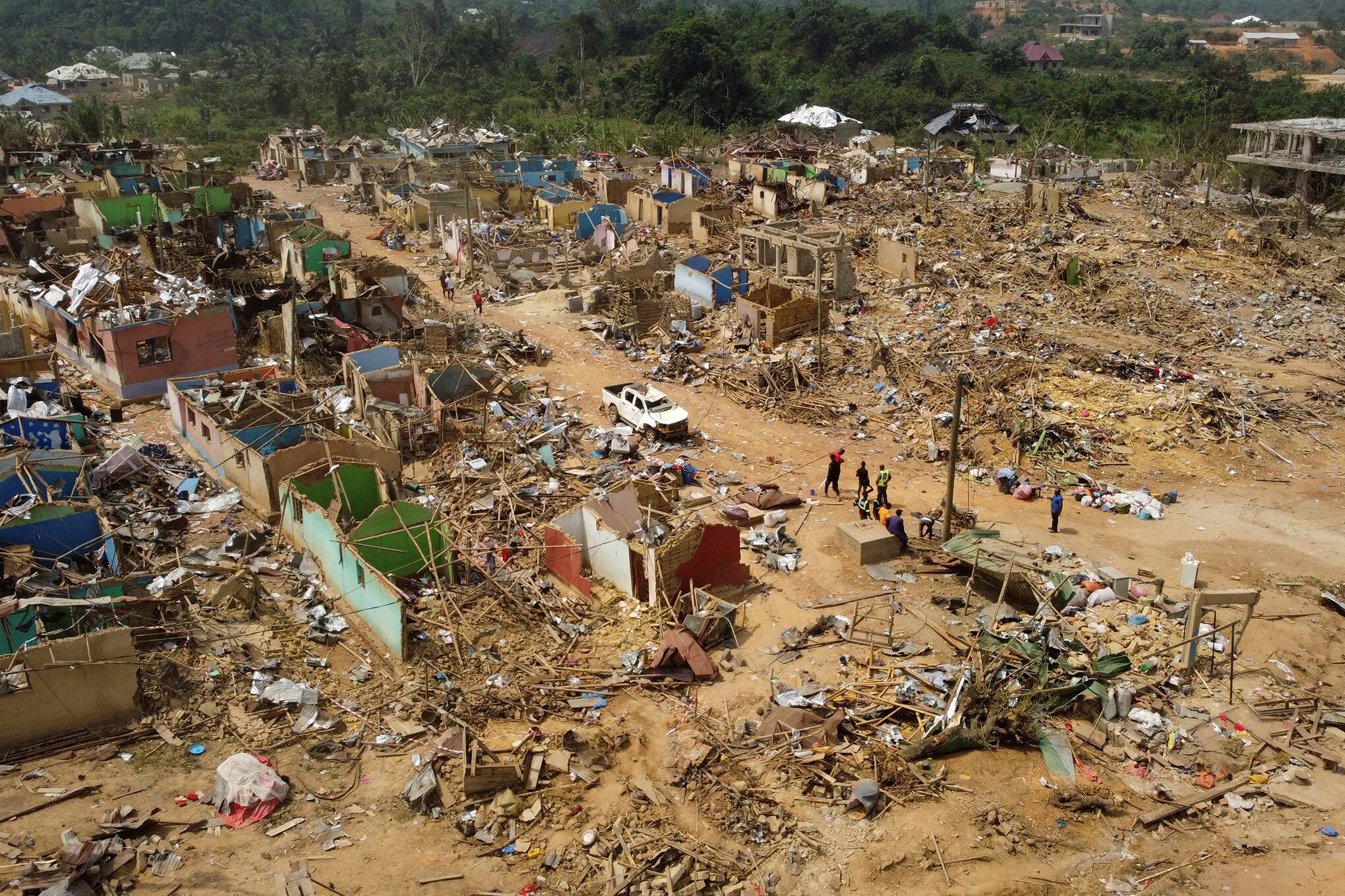 Una vista muestra los escombros de casas y otros edificios que fueron destruidos cuando un vehículo que transportaba explosivos de minería detonó a lo largo de una carretera en Apiate, Ghana. Foto REUTERS/Cooper Inveen