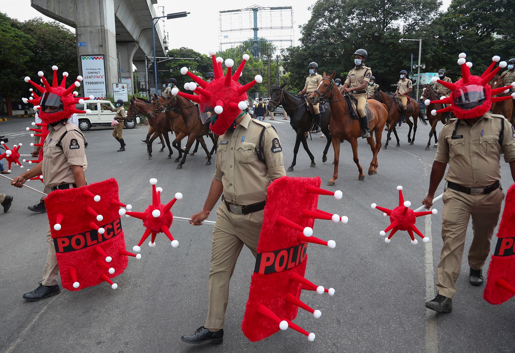 Foto: APAgentes de policía indios caminan con un casco con temática de virus durante una campaña de concientización destinada a prevenir la propagación del coronavirus en Hyderabad, India, el miércoles 9 de junio de 2021. Foto: AP / Mahesh Kumar A.