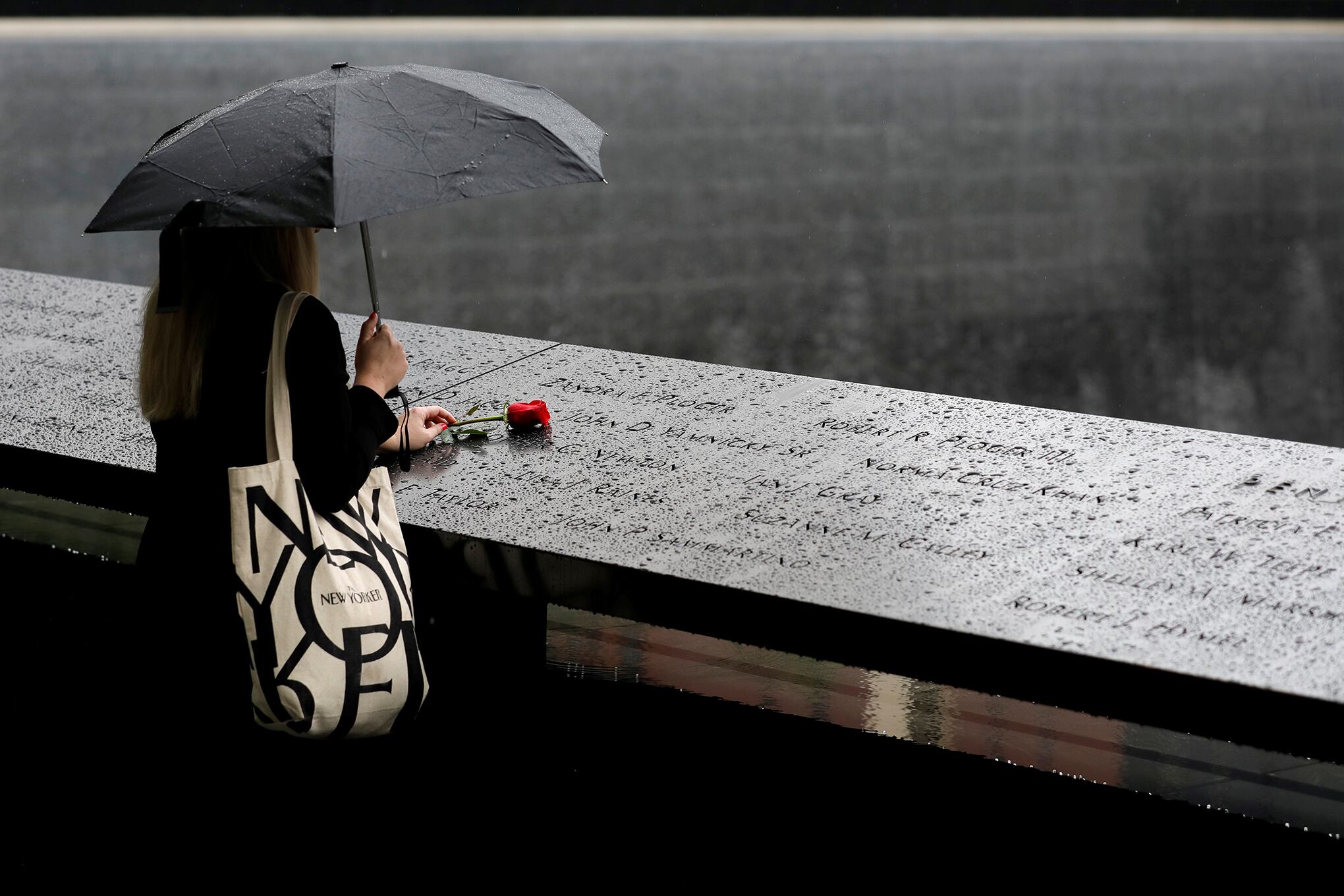 Una persona se encuentra en la lluvia con una rosa roja en el monumento en honor al 9/11, antes del vigésimo aniversario de los ataques en Manhattan, Nueva York, EE. UU., el 9 de septiembre de 2021. Foto: Reuters / Andrew Kelly.