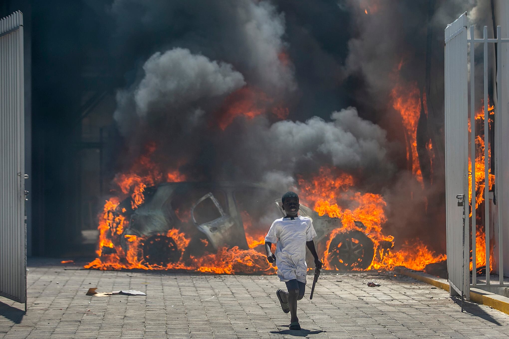 Foto: APUn niño sale corriendo del concesionario de automóviles Nissan incendiado durante una protesta de un sector de la fuerza policial conocida como Fantom 509 en Port-au-Prince, Haití, el miércoles 17 de marzo de 2021. El concesionario fue saqueado y vandalizado después de que los oficiales irrumpieran e incendiaron algunas comisarías, liberando a los camaradas encarcelados acusados de participar en un presunto golpe de Estado contra el asediado presidente Jovenel Moise el mes pasado. (Foto AP / Dieu Nalio Chery)