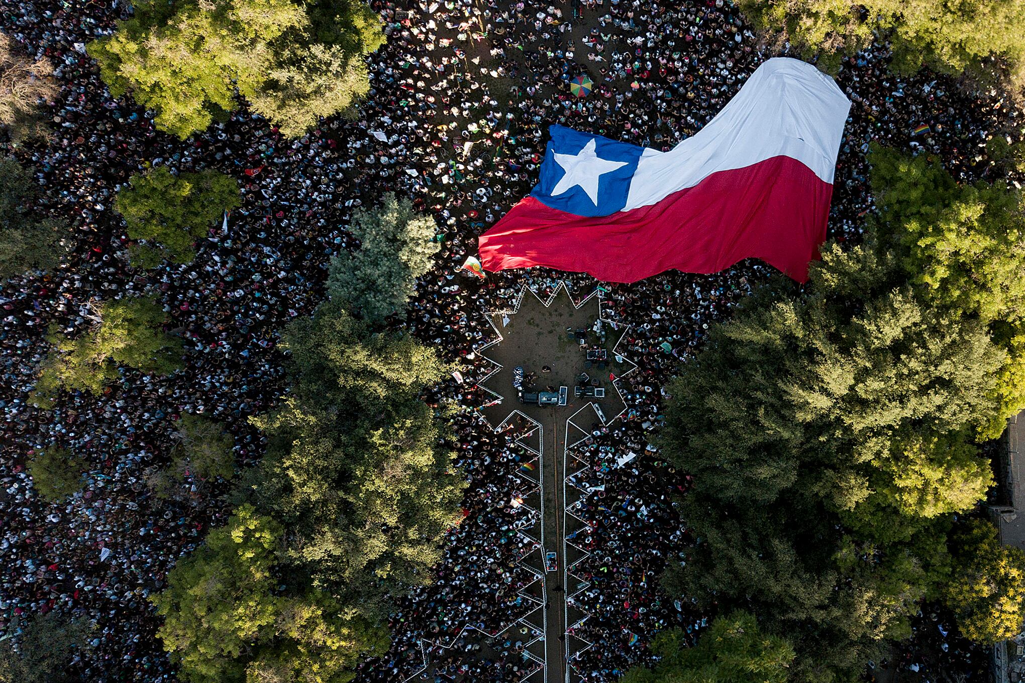 Simpatizantes del candidato presidencial Gabriel Boric, de la coalición Apruebo la Dignidad, asisten a la manifestación de clausura de su campaña antes de la segunda vuelta de las elecciones presidenciales en Santiago, Chile, el jueves 16 de diciembre de 2021. Foto: AP / Matias Delacroix.