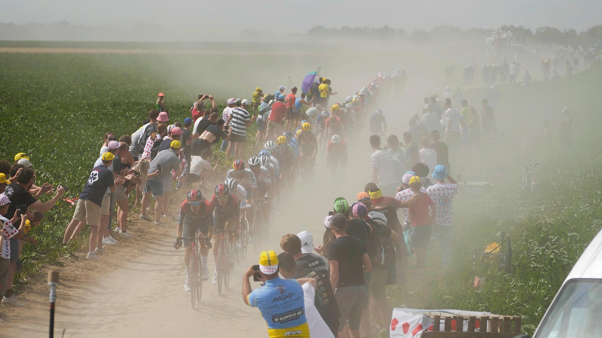 Un pelotón, con el británico Geraint Thomas en segunda posición, cabalga sobre los adoquines en la quinta etapa de la carrera ciclista del Tour de Francia de más de 157 kilómetros (97,6 millas) con inicio en Lille Metropole y final en Arenberg Porte du Hainaut, Francia, el miércoles 6 de julio , 2022. Foto AP/Thibault Camus