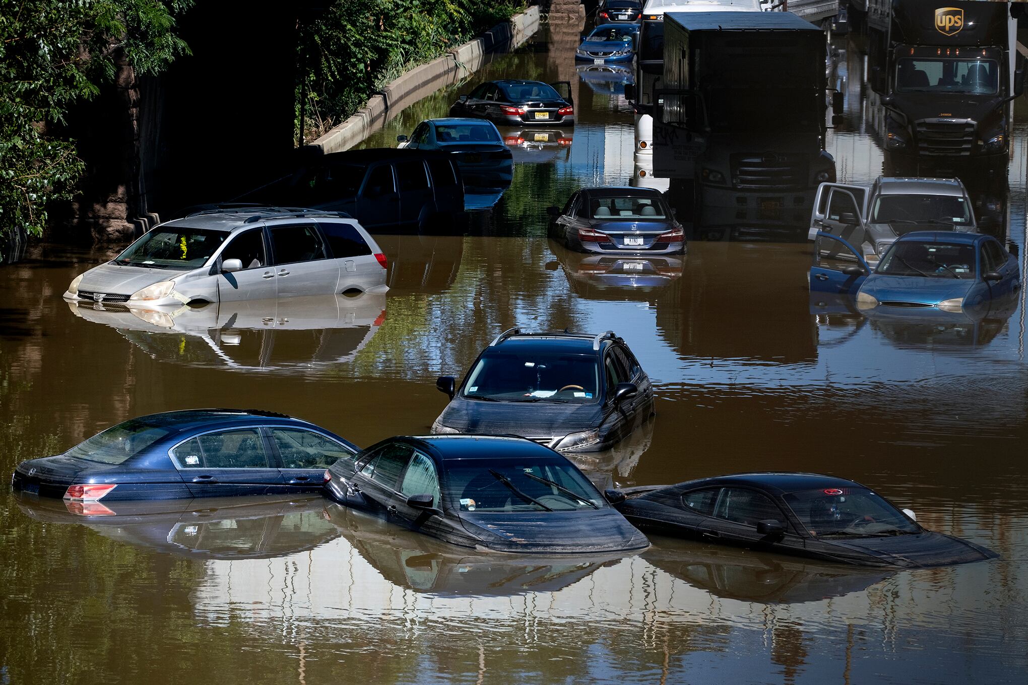 Automóviles y camiones en medio del agua el jueves 2 de septiembre de 2021, en la principal autopista de Deegan Expressway en Bronx Borough (New York), luego del paso del ciclón Ida. (Foto de AP / Craig Ruttle)