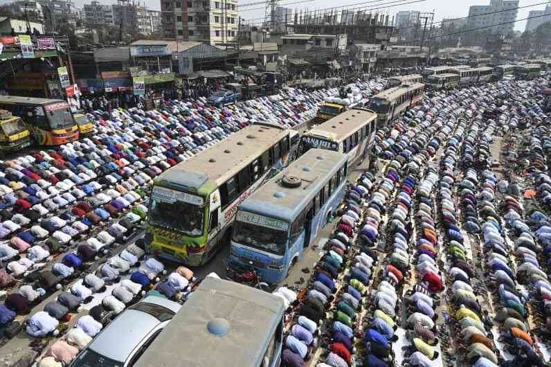 Devotos musulmanes rezan durante la segunda congregación de musulmanes más grande del mundo, también conocida como Biswa Ijtema, en Tongi, a unos 30 km del norte de Dhaka el 15 de febrero de 2019. Varios millones de devotos musulmanes de todo el mundo se unen durante cuatro días en el evento que termina con una oración especial. FOTO: MUNIR UZ ZAMAN / AFP
