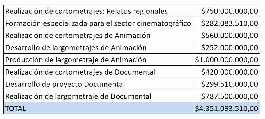 Este año el FDC apoyará las categorías Animación, Documental, Formación Especializada para el Sector Cinematográfico y Realización de Cortometrajes: Relatos Regionales. Este es el presupuesto que recibirá cada uno y la lista da ganadores.