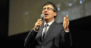 El presentador John Oliver recibió su premio vestido con una sudadera roja y sentado en una silla de oficina frente a una mesa de vidrio.
